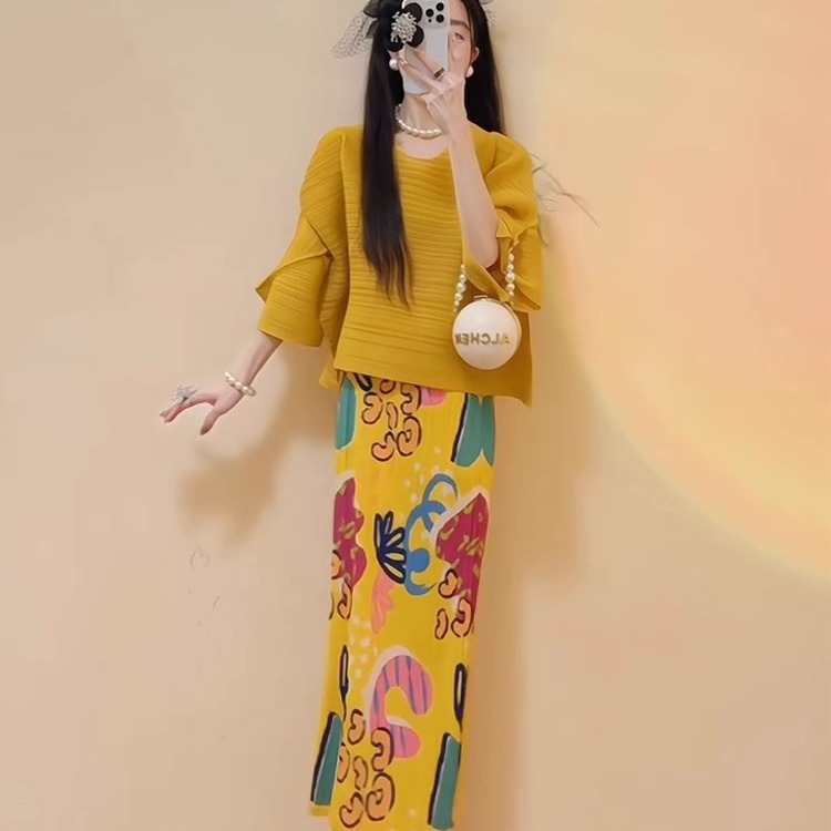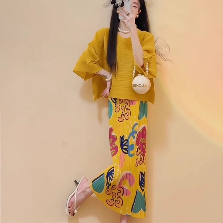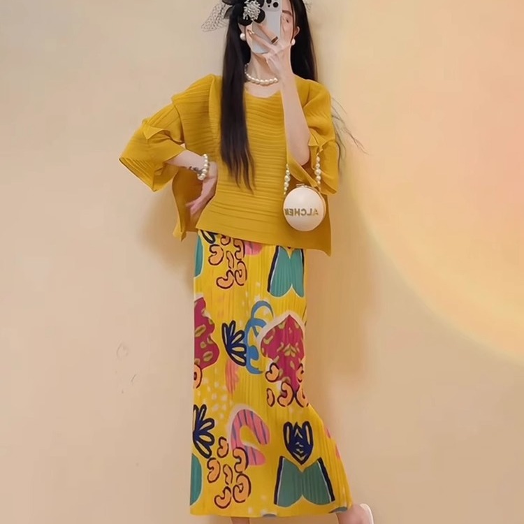 三宅印花黄色褶皱套装