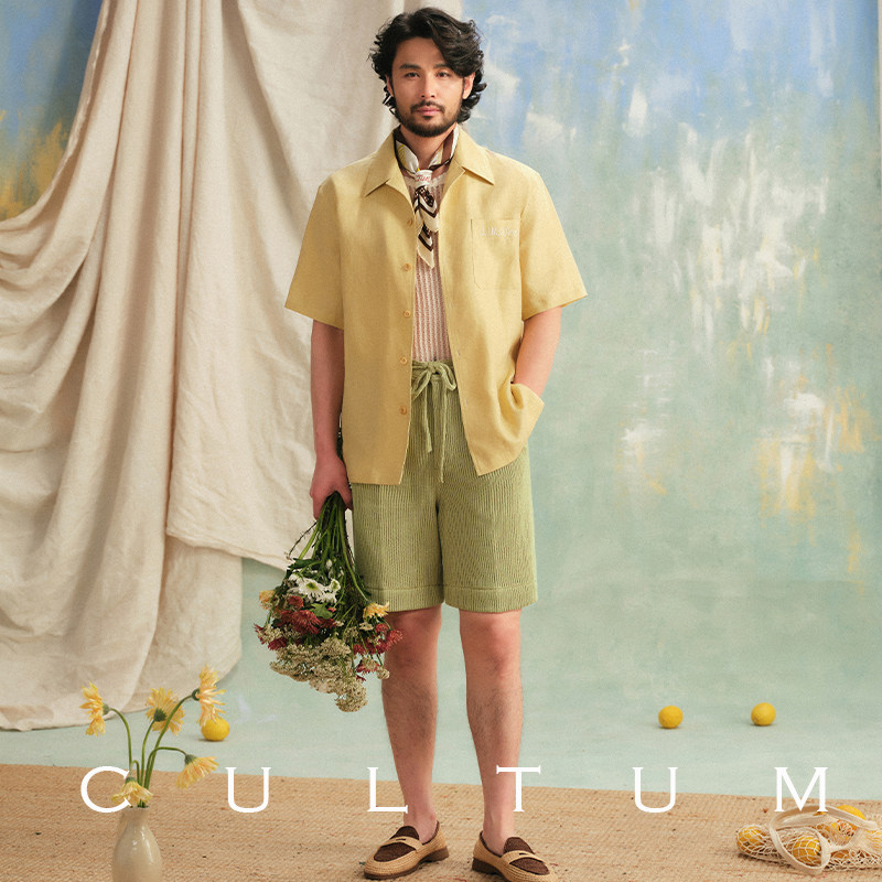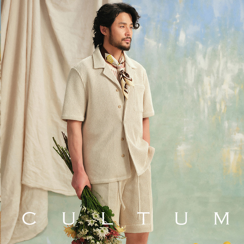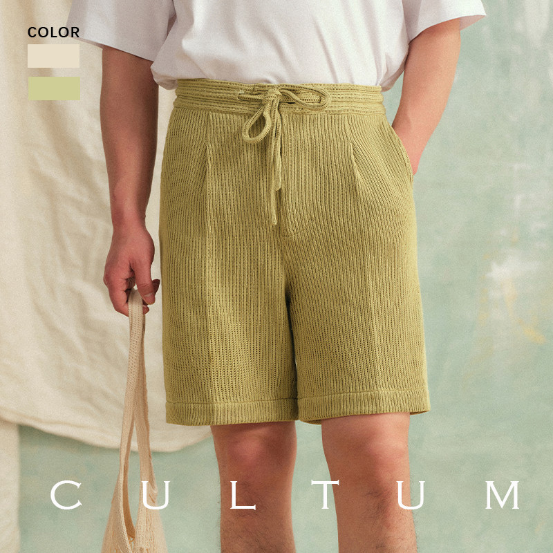 【可水洗易打理】CULTUM慵懒度假风针织松紧腰抽绳单褶直筒短裤男