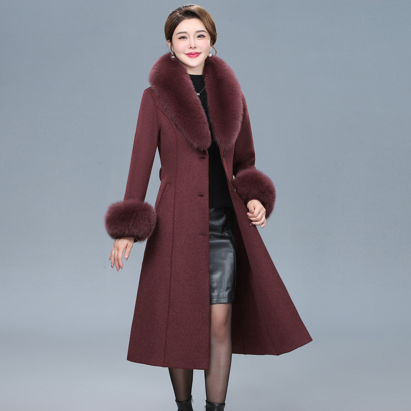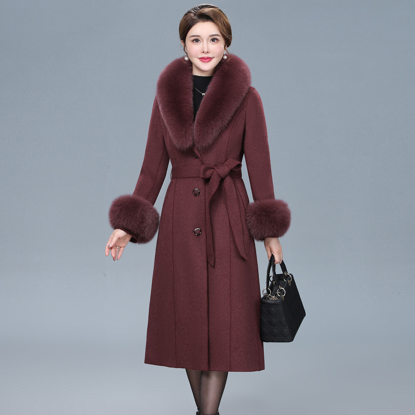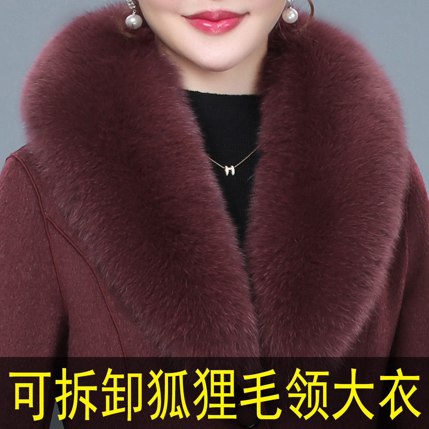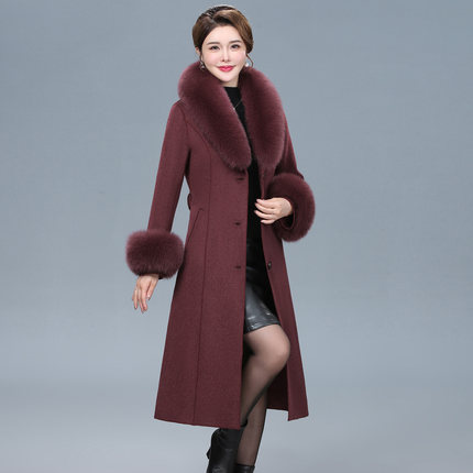 狐狸毛领双面羊绒大衣女中长款中年胖妈妈装洋气大码羊毛呢子外套