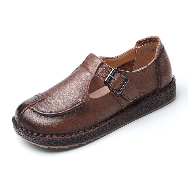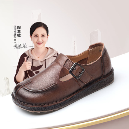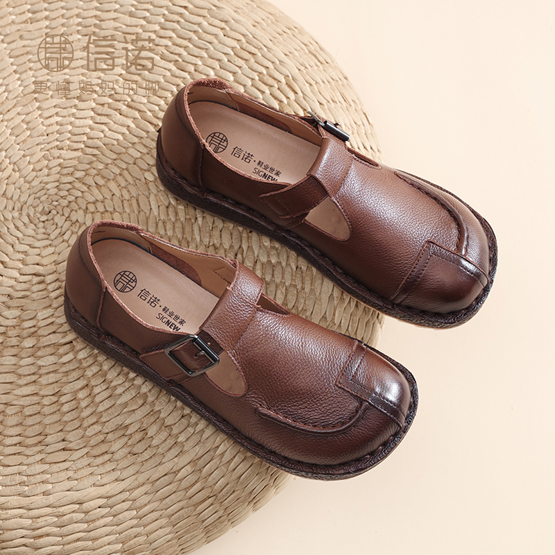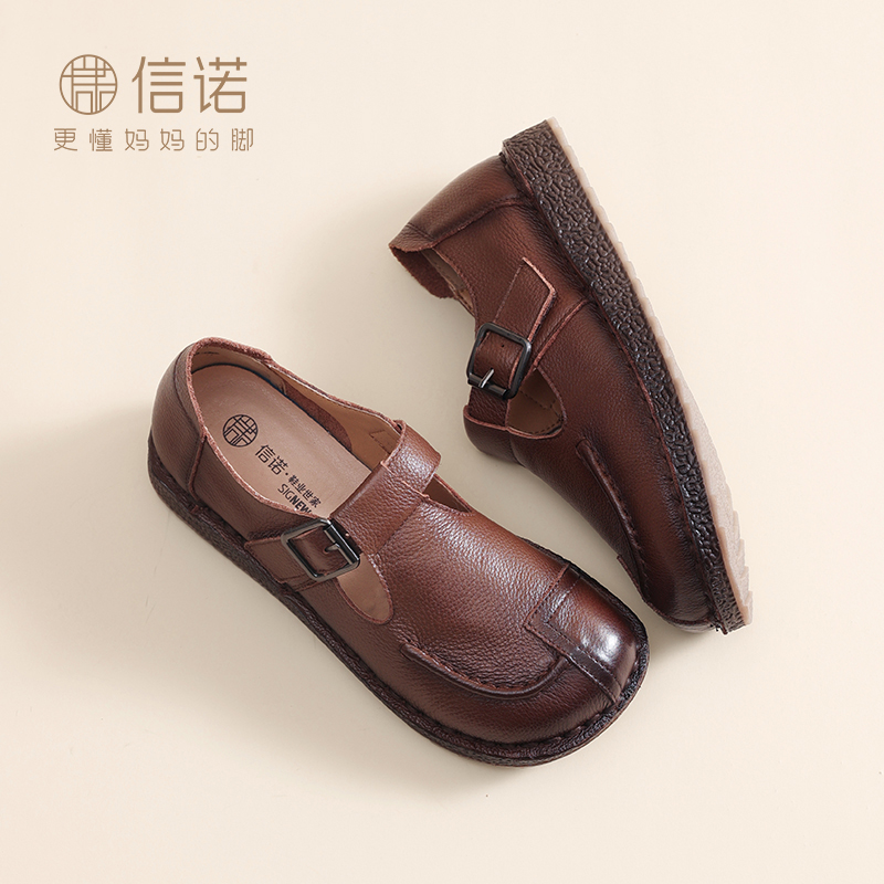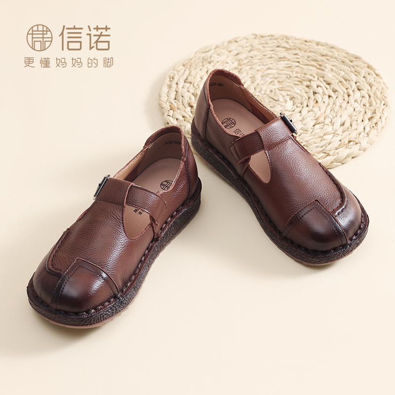 信诺复古真皮平底单鞋女2025春秋季新款镂空皮鞋中老年软底妈妈鞋
