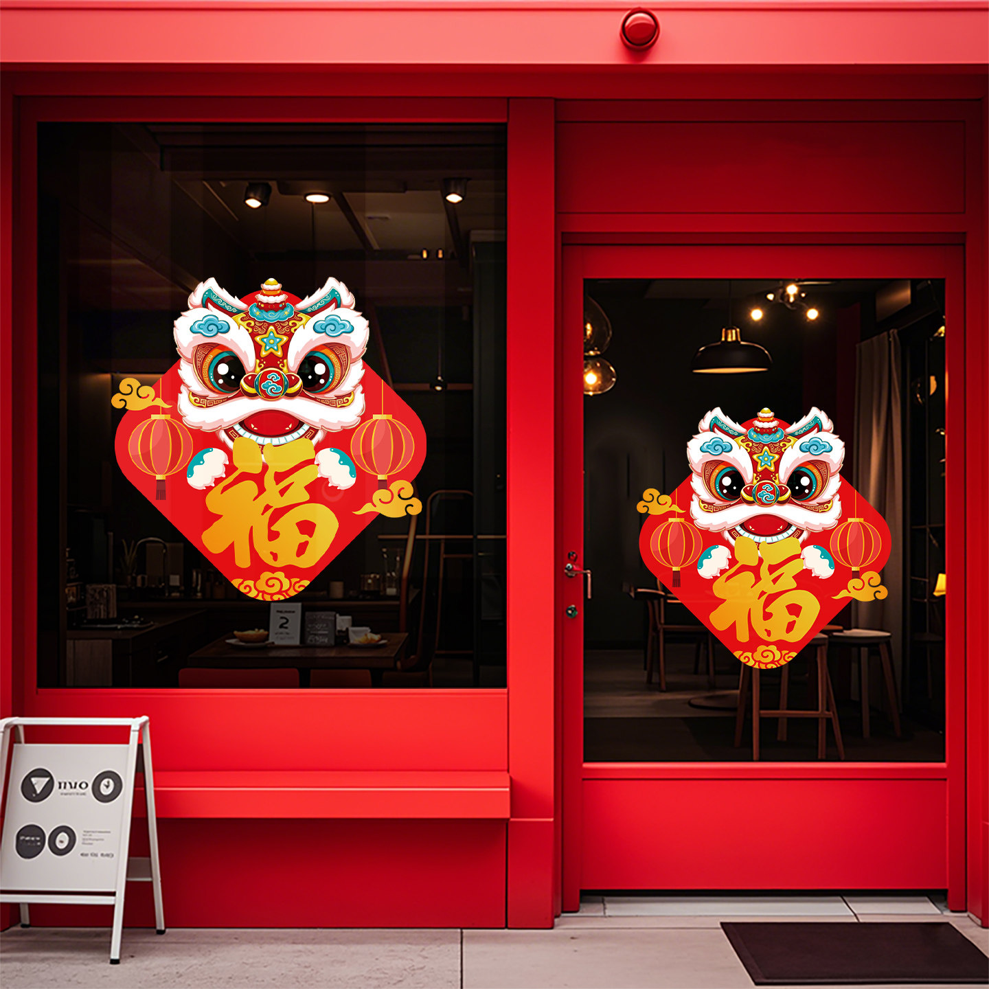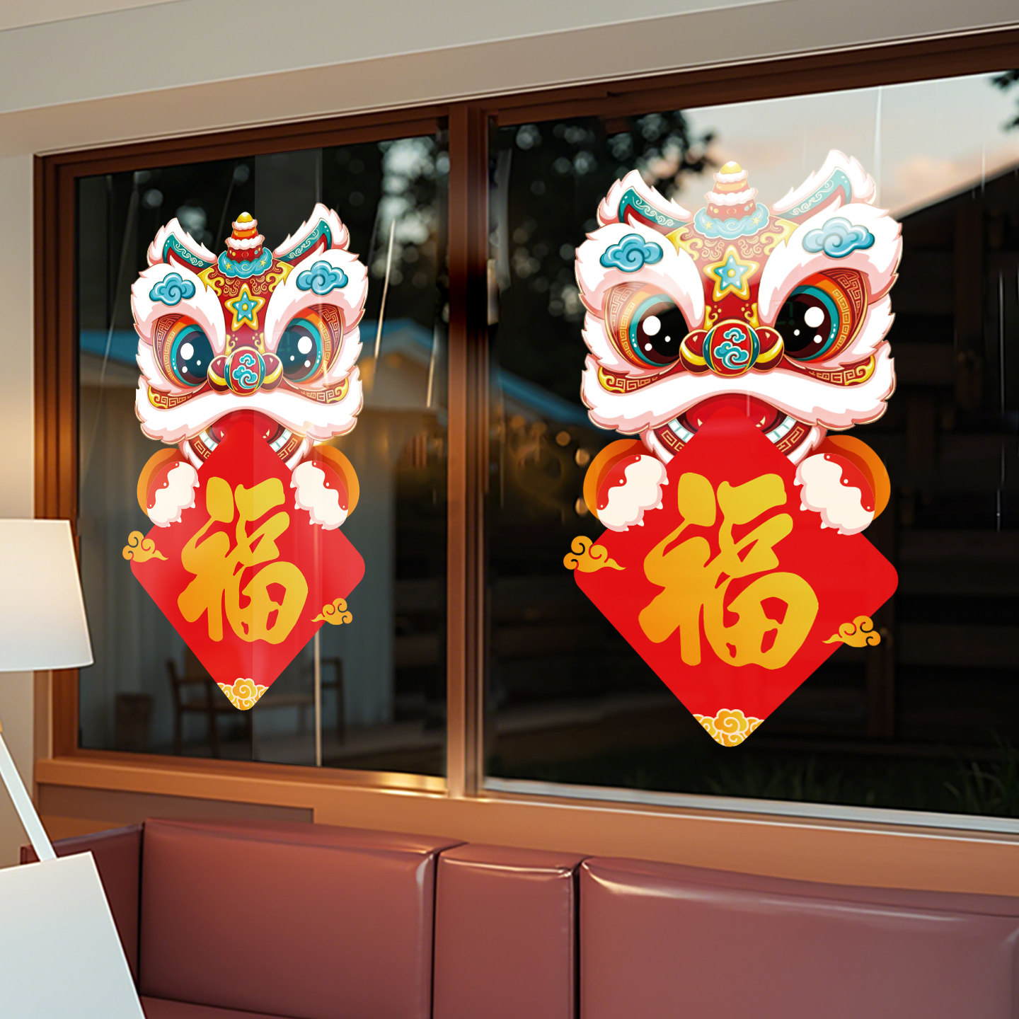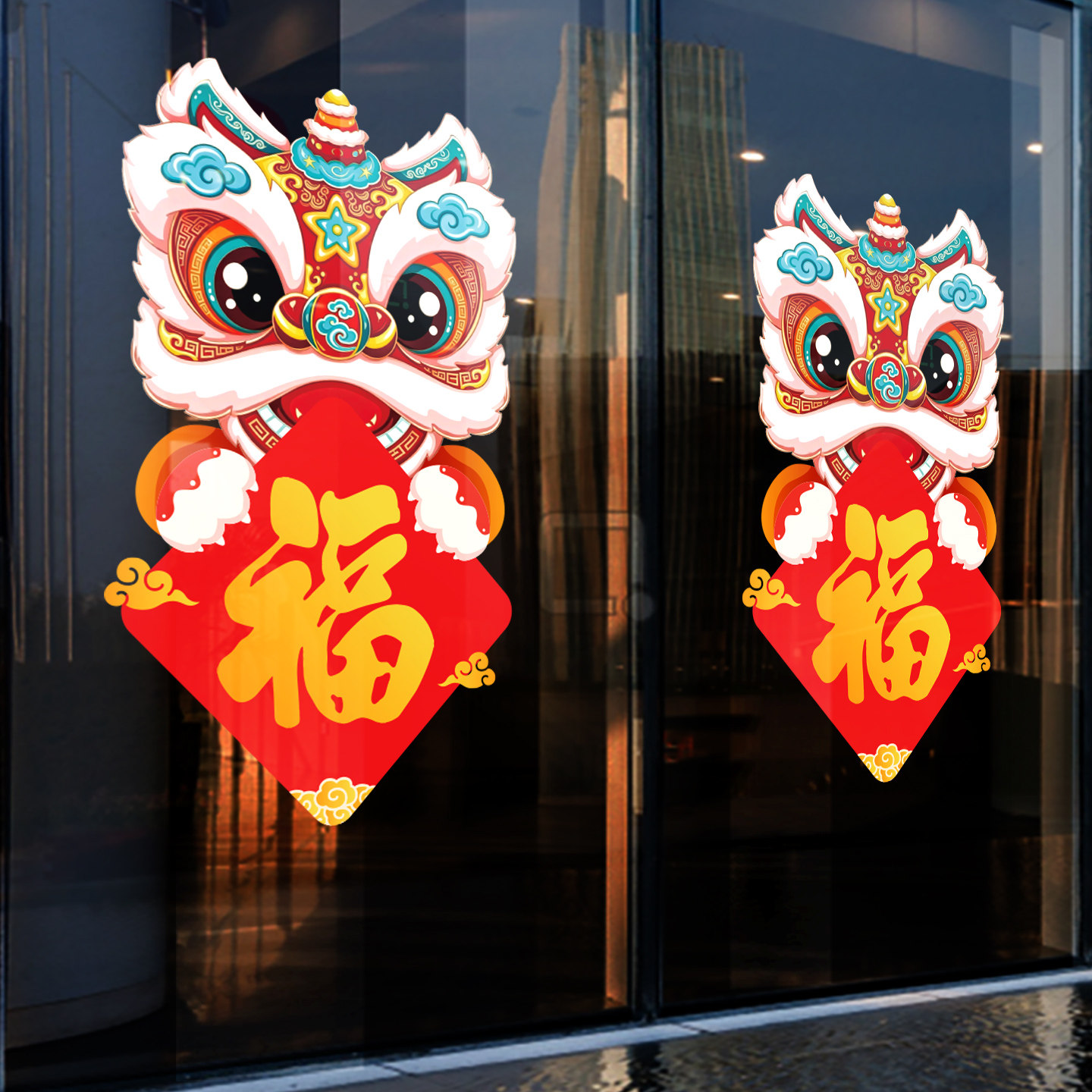 新年装扮春节过年场景氛围布置贴纸国潮醒狮福字静电玻璃门贴橱窗