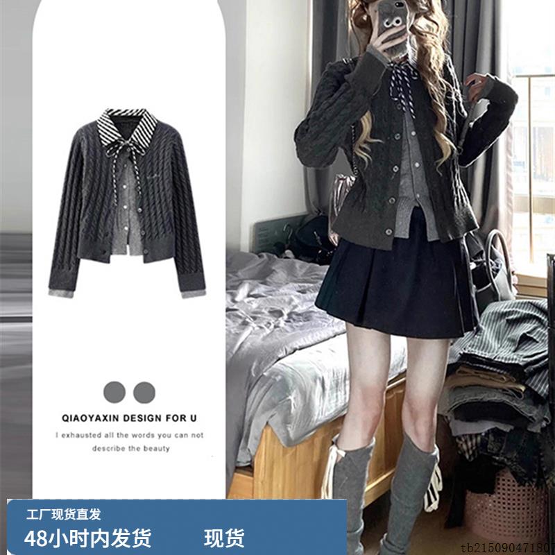 2025秋冬季新款温柔覆古学院感假两件毛衣女减龄针织开衫上衣外套