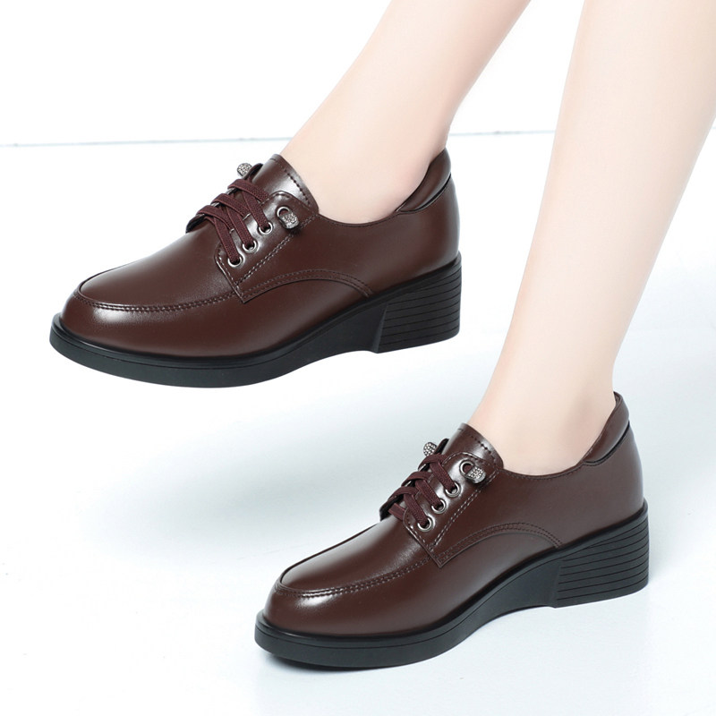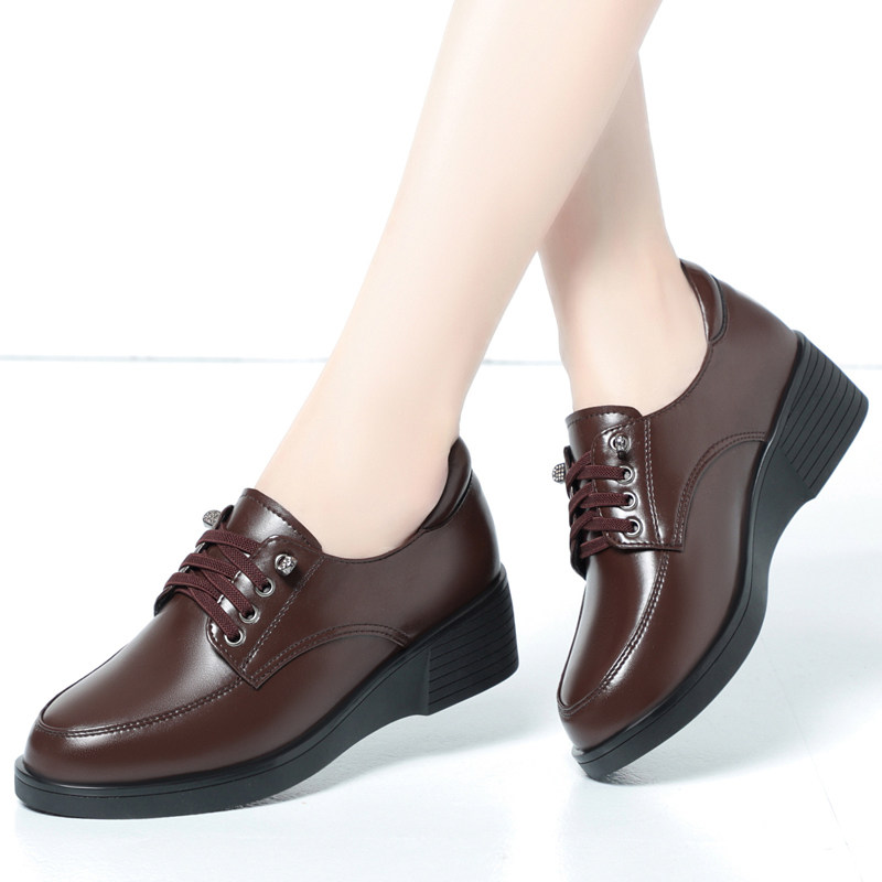 软皮软底单鞋女中老年妈妈鞋舒适不磨脚春秋系带女鞋坡跟平底皮鞋
