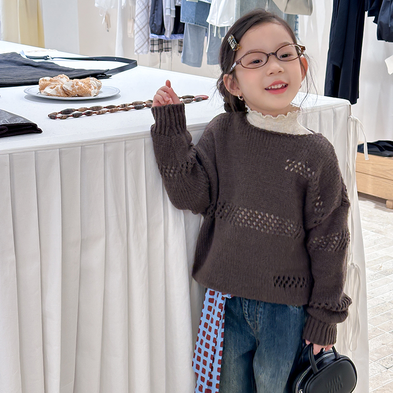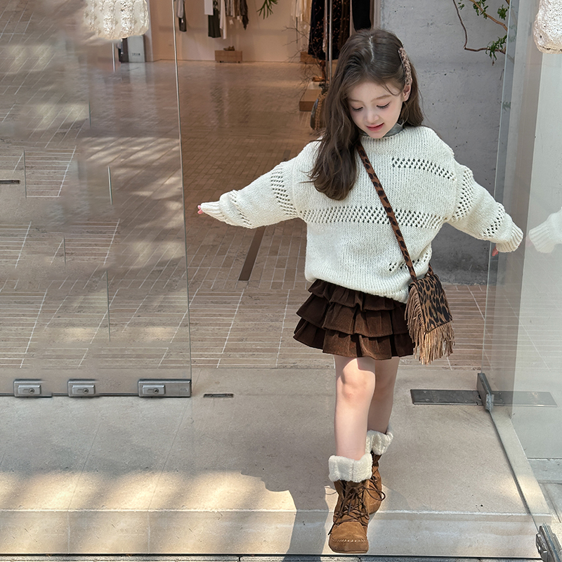 Yumi妈女童秋季宽松洋气叠穿镂空毛衣儿童宝宝针织罩衫25G099
