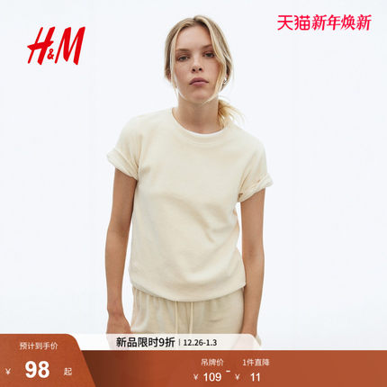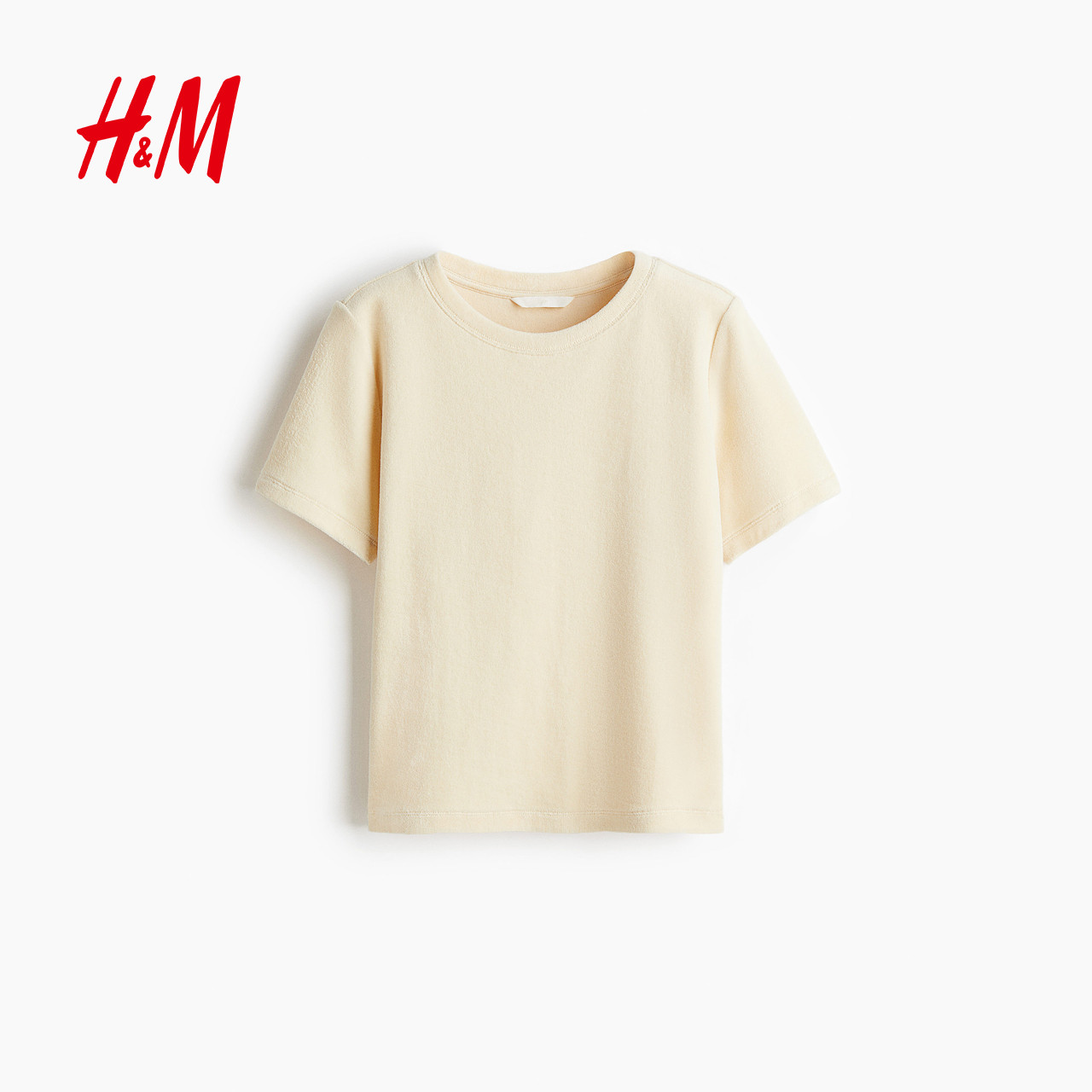 HM女装T恤春季柔软舒适丝绒圆领直筒短袖上衣1300652