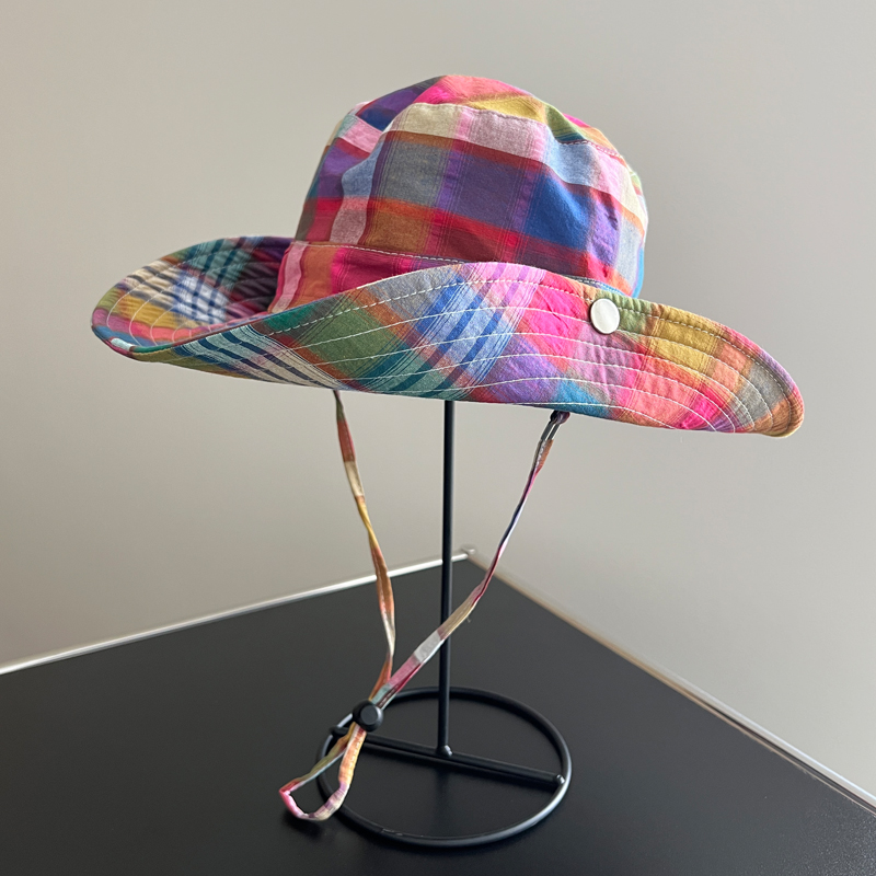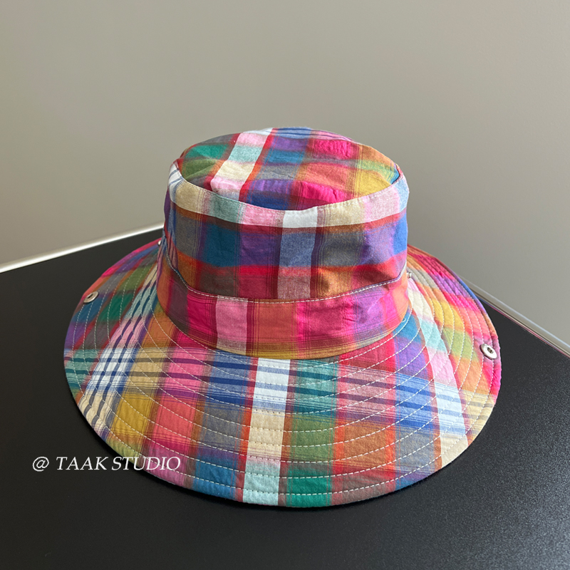 多巴胺彩色格子露营登山帽户外渔夫帽子女夏天韩版防晒遮阳帽盆帽