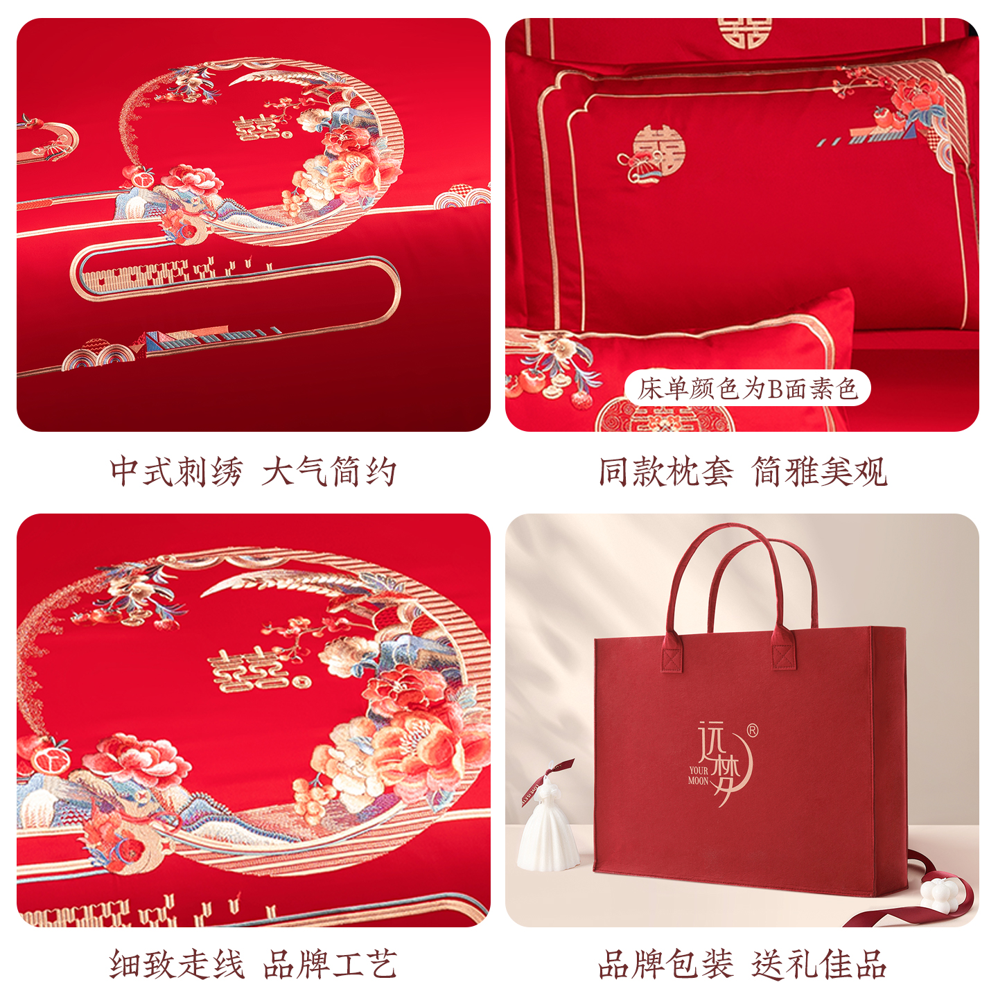 远梦婚庆四件套全棉60支贡缎刺绣床单式纯棉被套新中式结婚庆用品