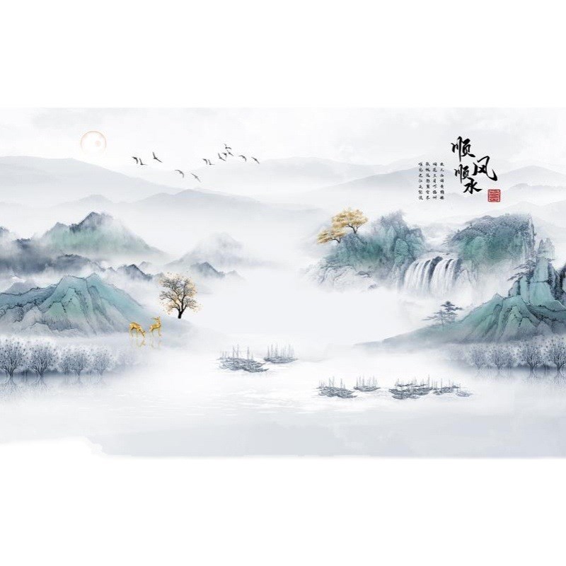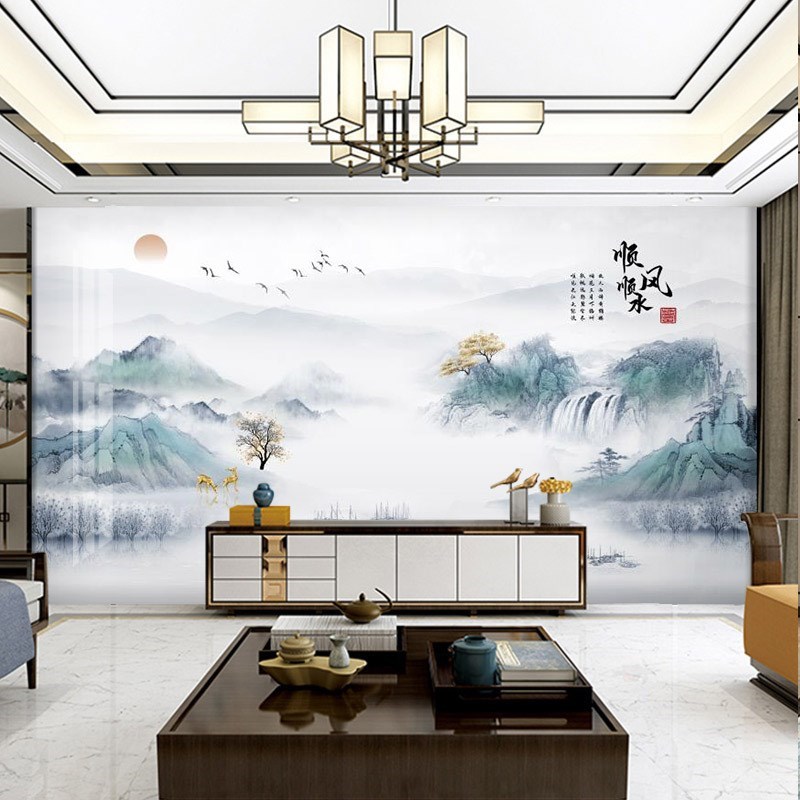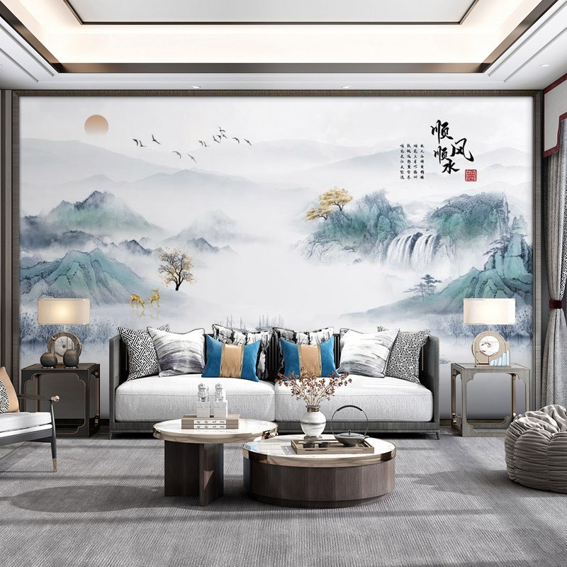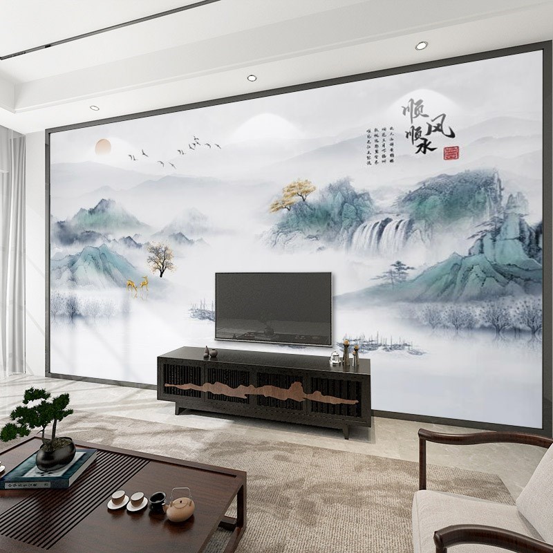 新中式意境轻奢山水壁布电视背景墙壁纸壁画客厅沙发无缝墙布墙纸