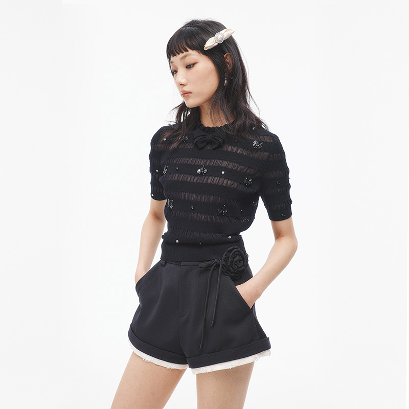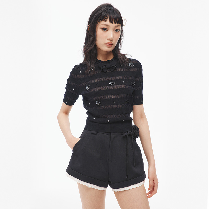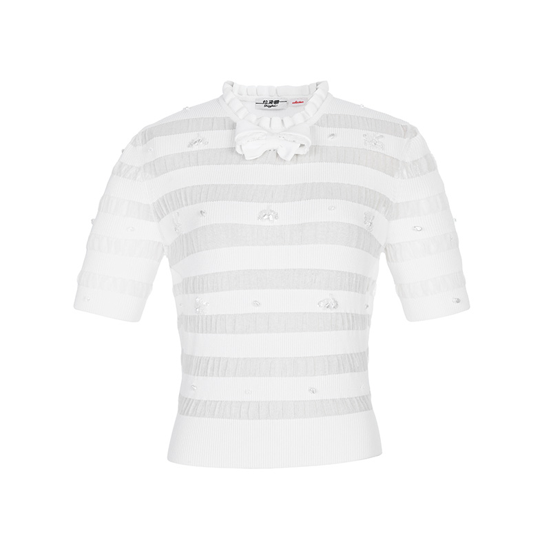 lefame拉飞姆2025夏季新款百搭纯色质感钉珠针织短袖T恤上衣女