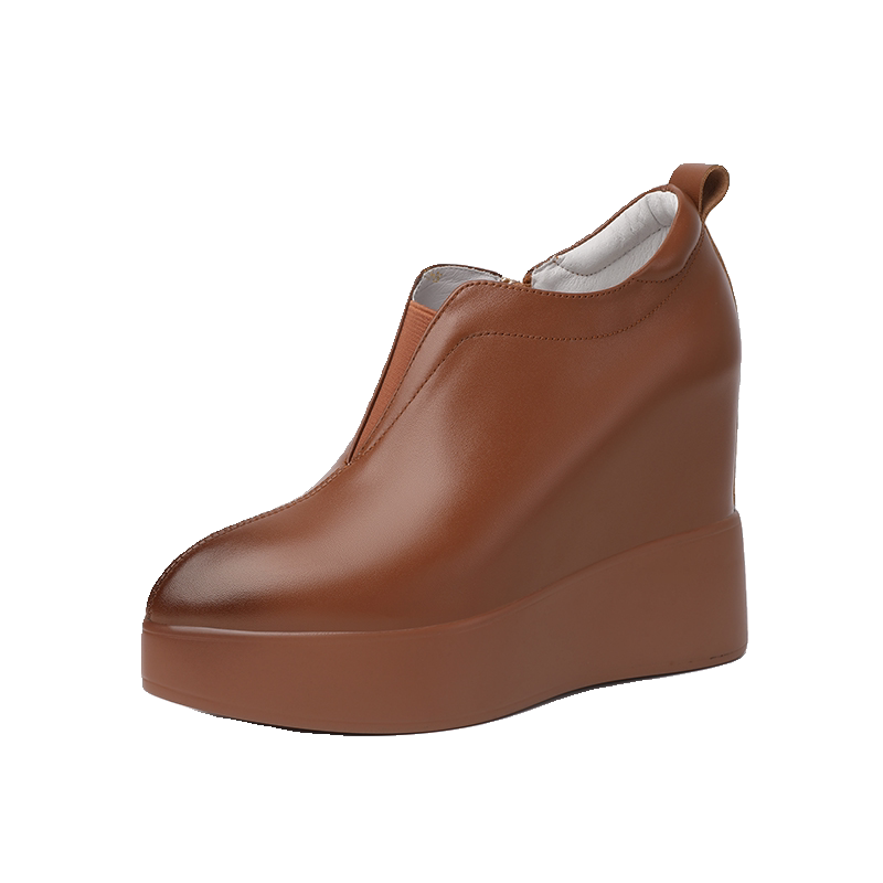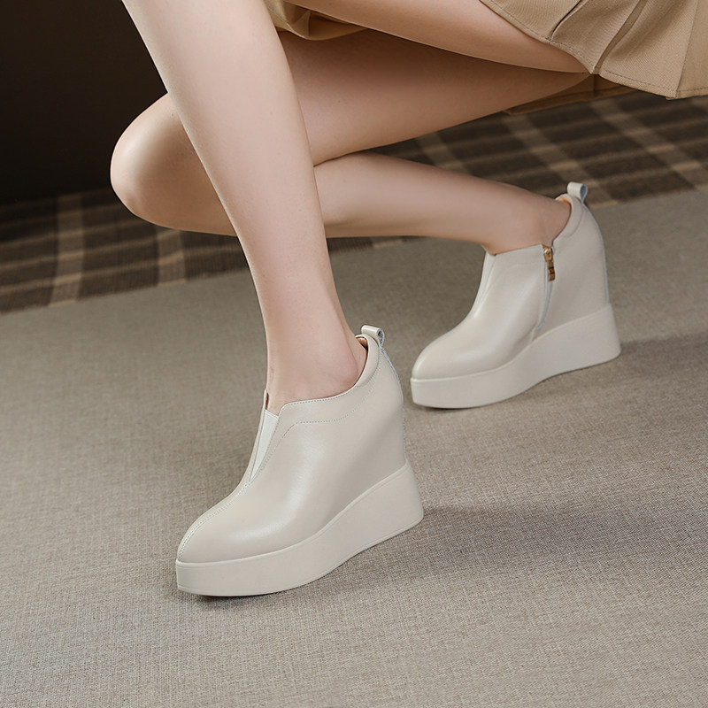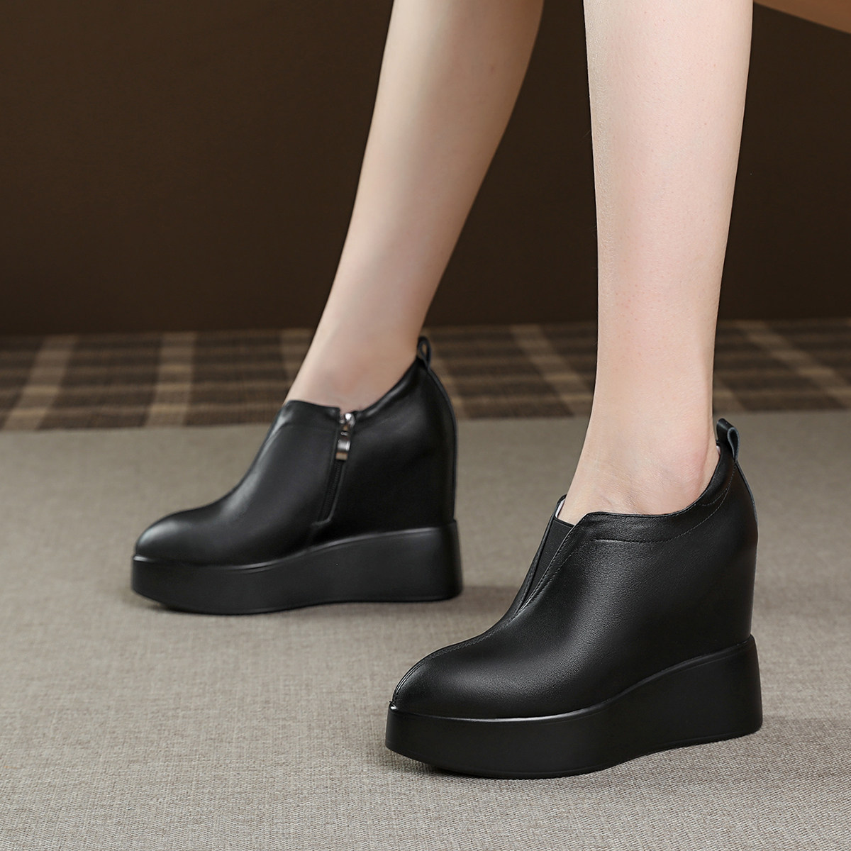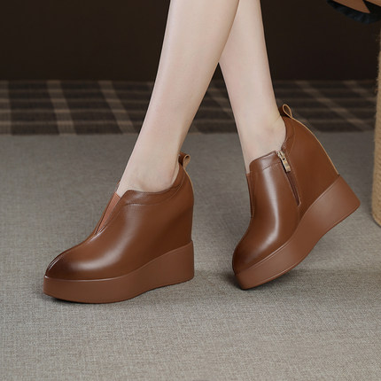 12cm内增高女鞋粗跟高跟坡跟厚底防水台小个子增高鞋新款真皮单鞋