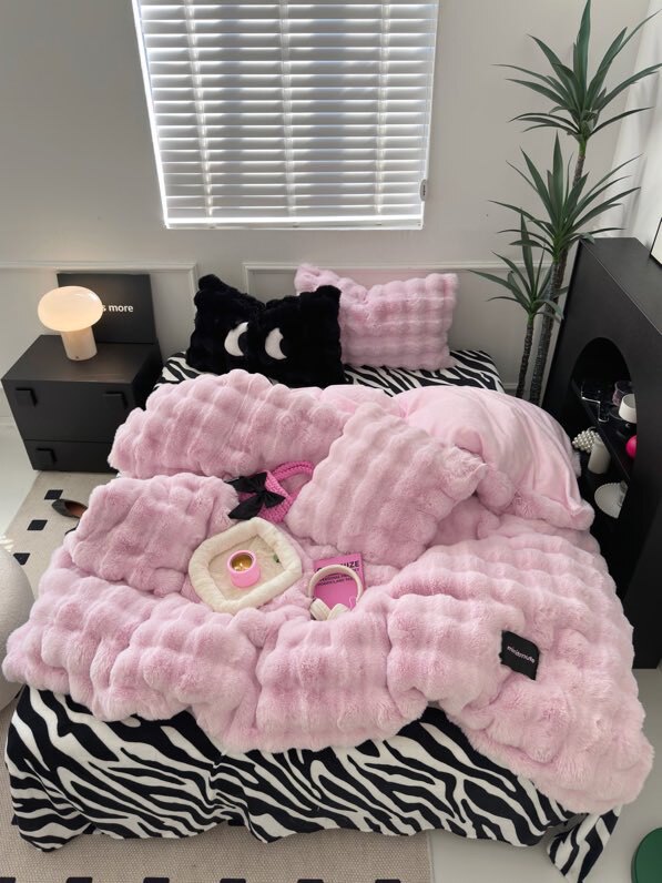 少女豹纹风加厚兔毛绒冬款时髦大眼睛四件套牛奶绒双面珊瑚绒床笠