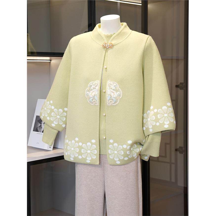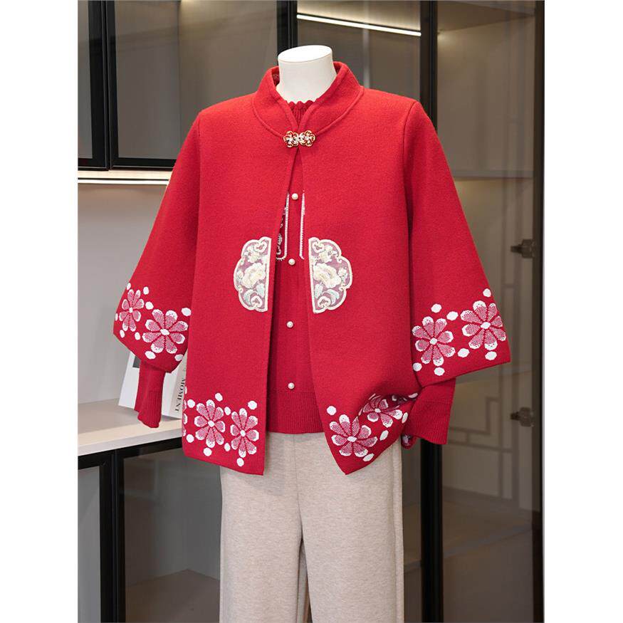 简溪奶奶秋冬装新款针织上衣国风两件套装50岁中老年女装开衫外套