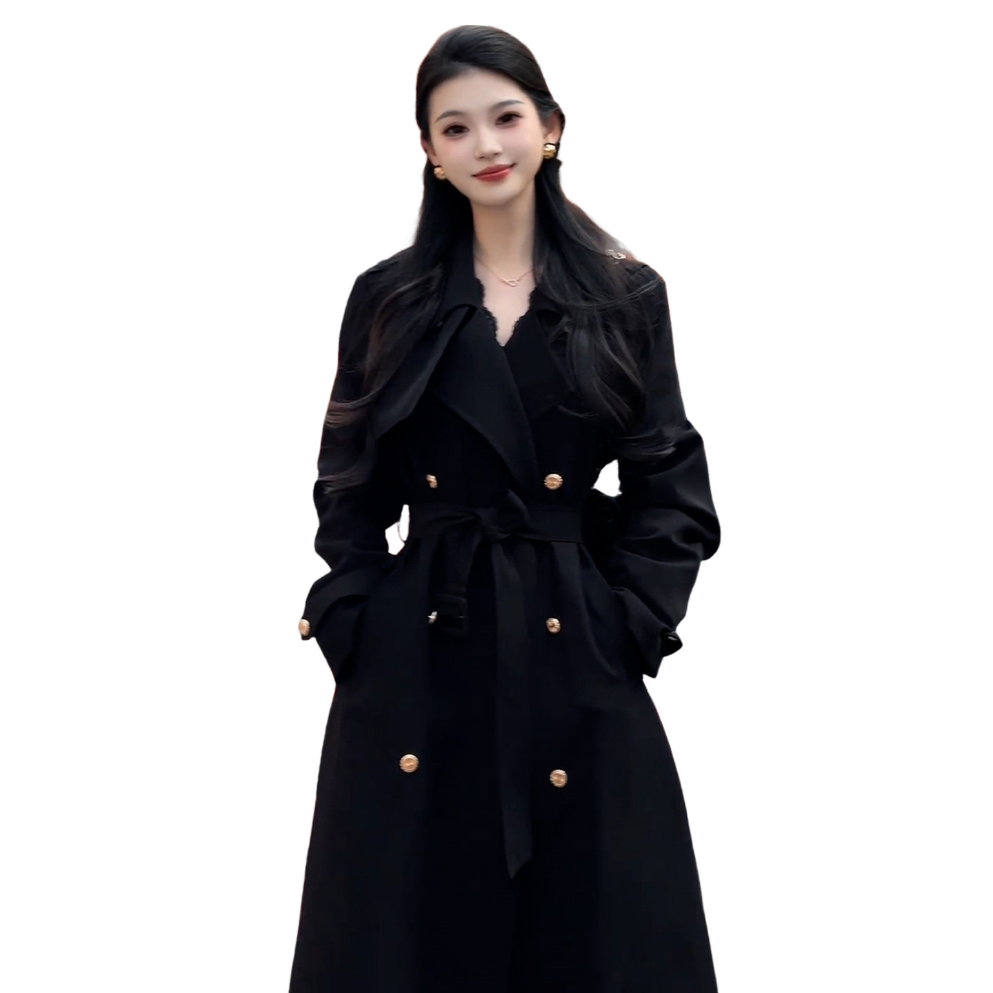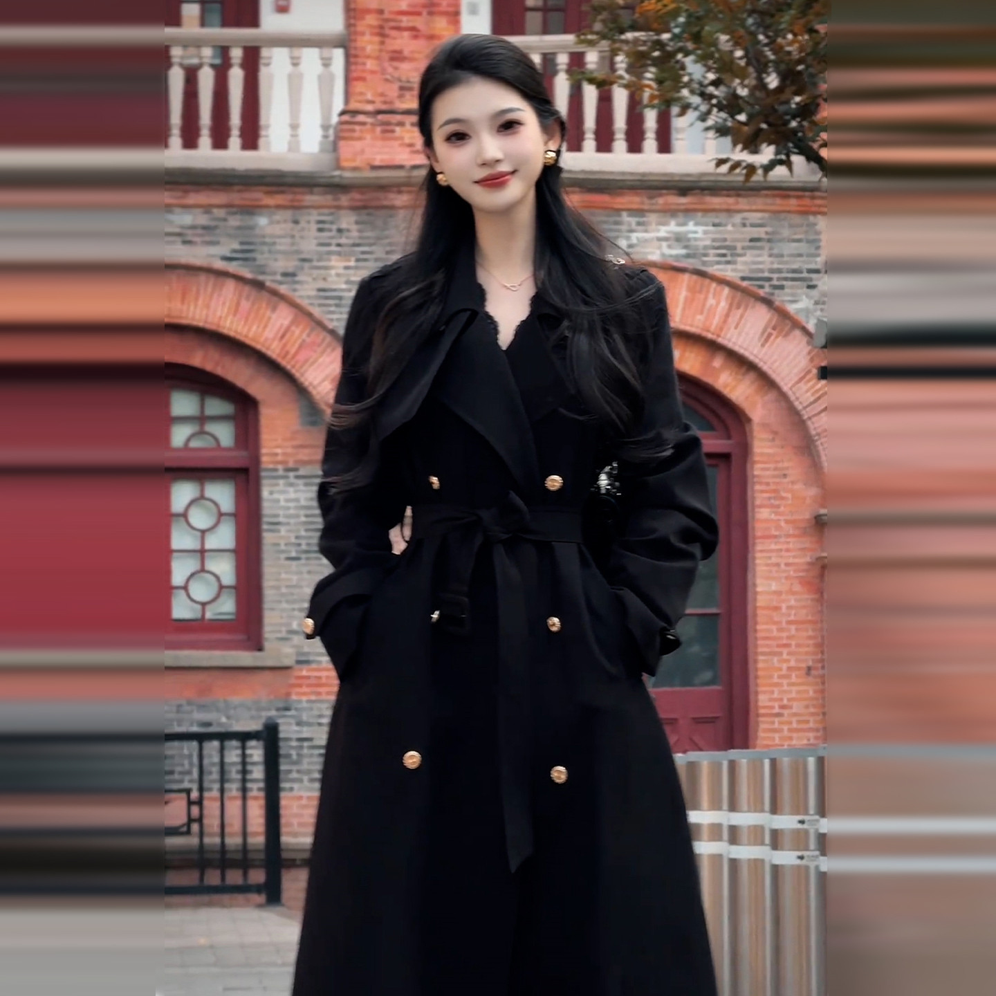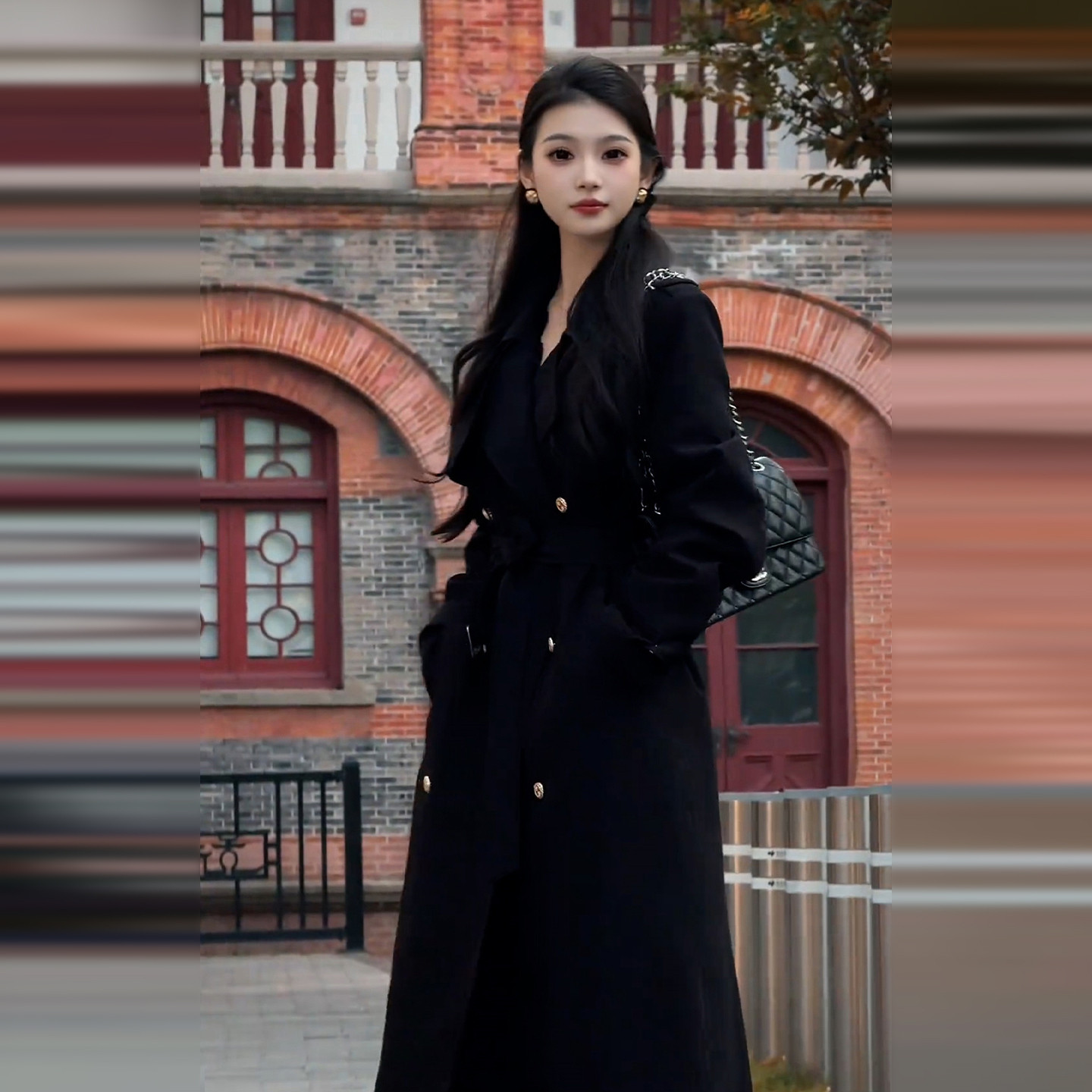 高级感黑色系带收腰长袖风衣外套女秋冬季加厚夹棉正肩大衣中长款