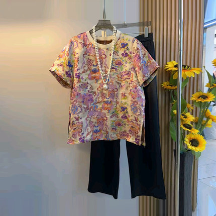 大码女装圆领短袖花朵上衣胖妹妹宽松遮胯黑色显瘦松紧腰直筒长裤