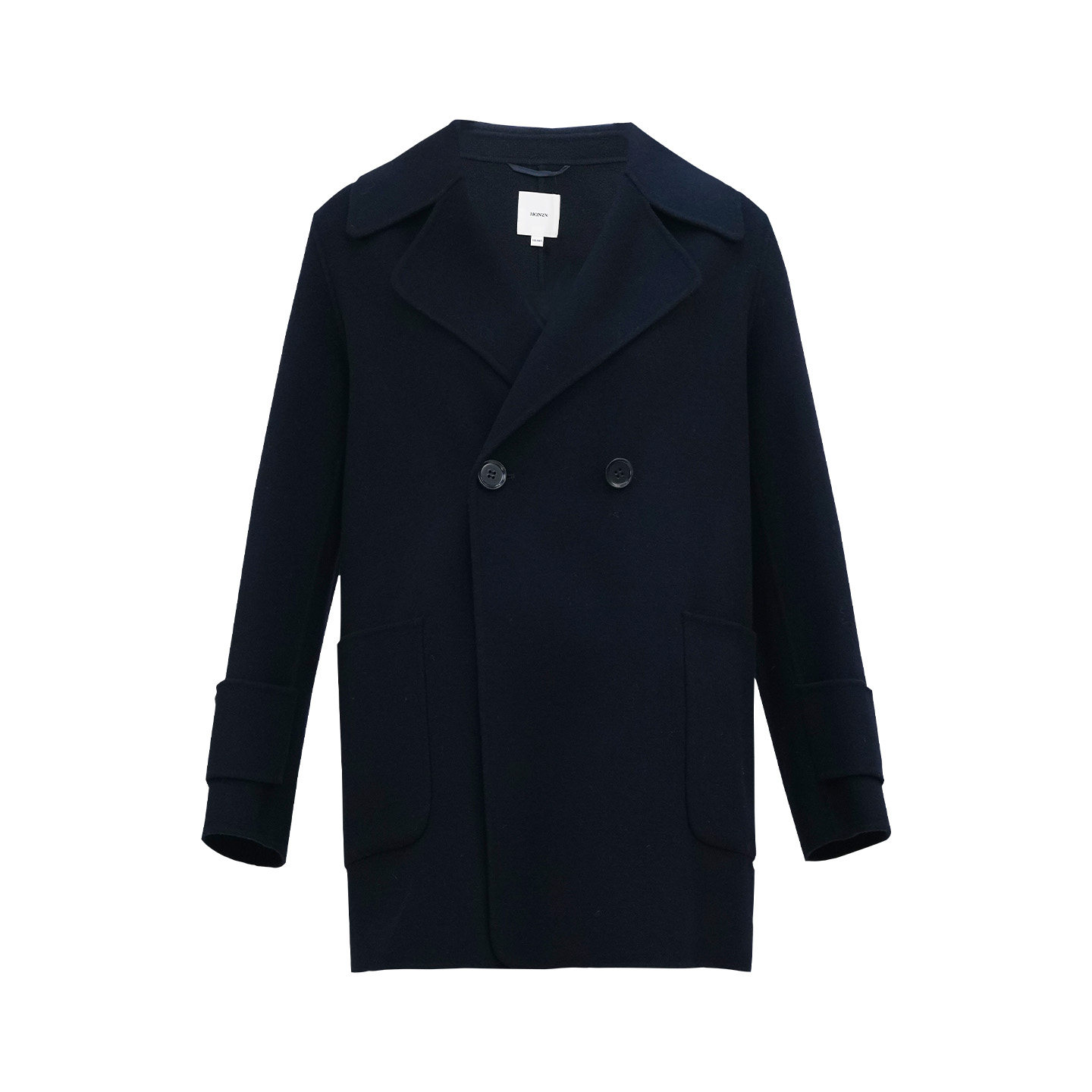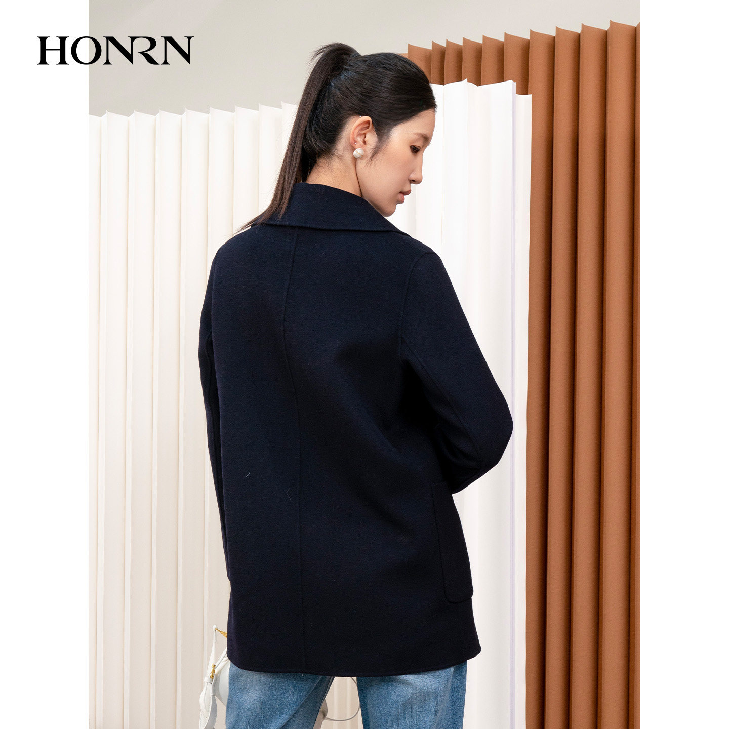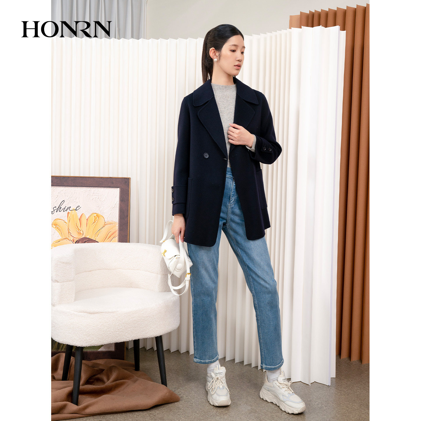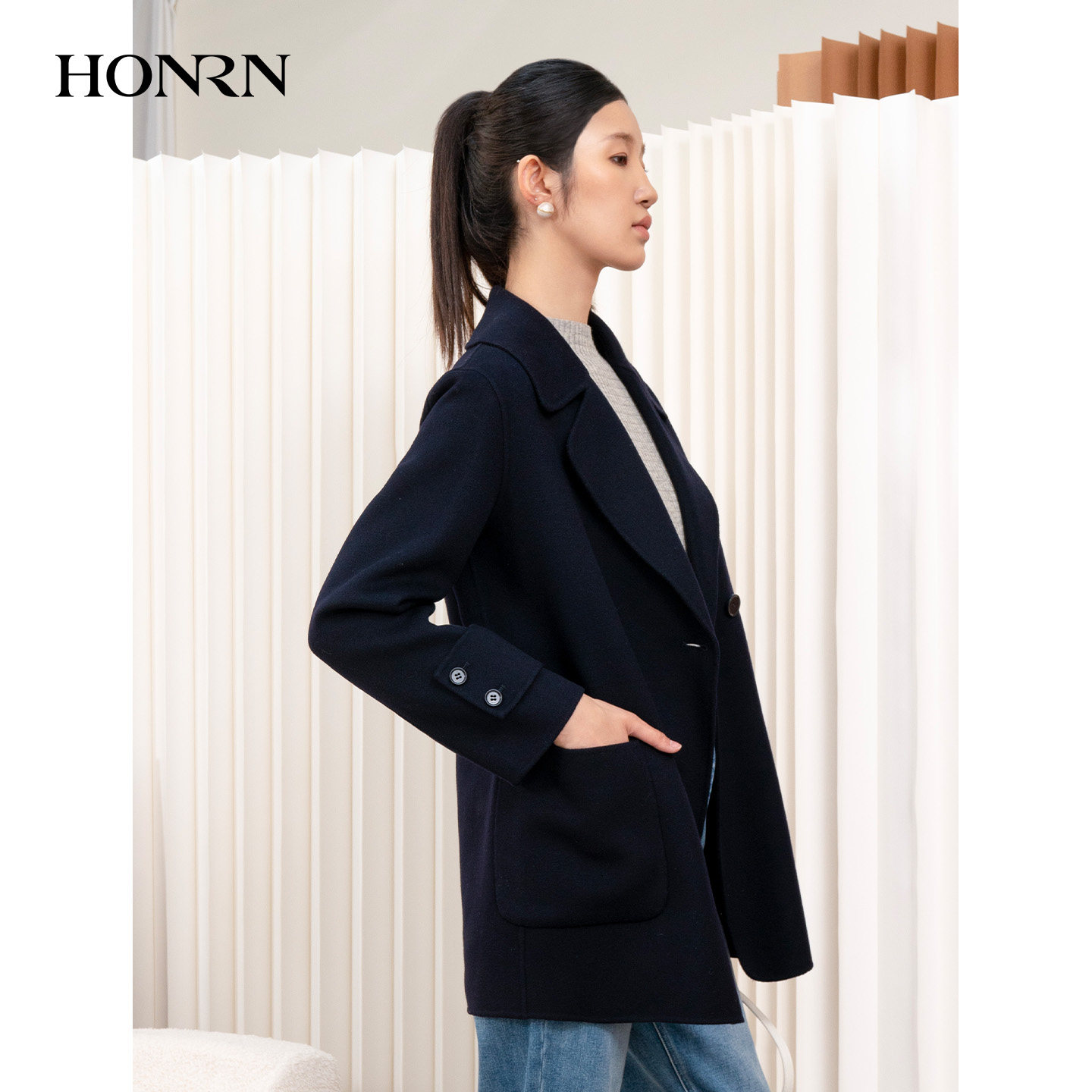 HONRN/红人休闲蓝色中长款双面羊毛呢子大衣外套女秋冬HI55OD774