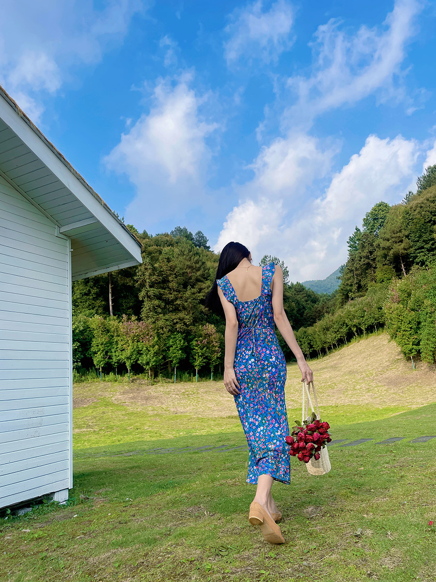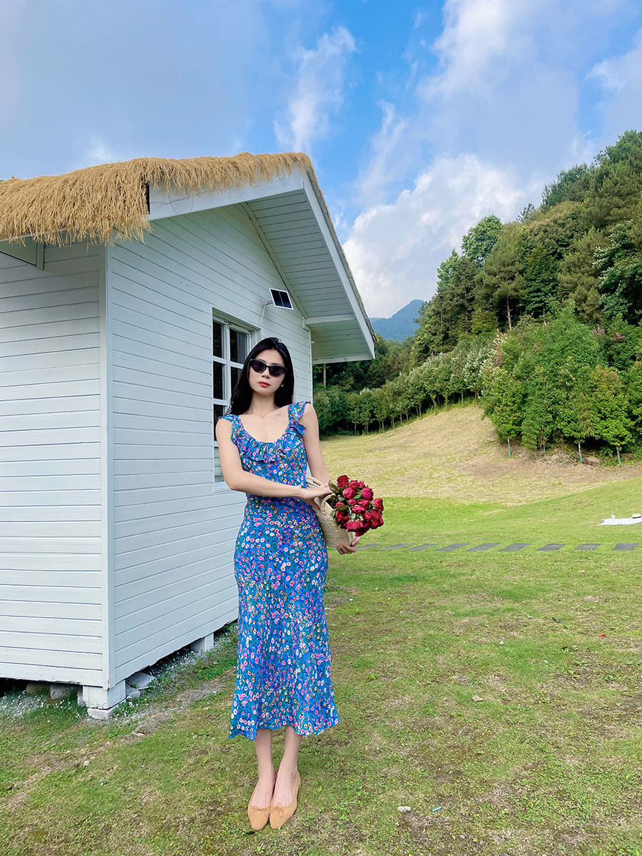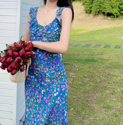 小鱼自制法式复古真丝荷叶花边吊带连衣裙 中长款度假长裙