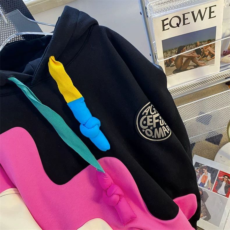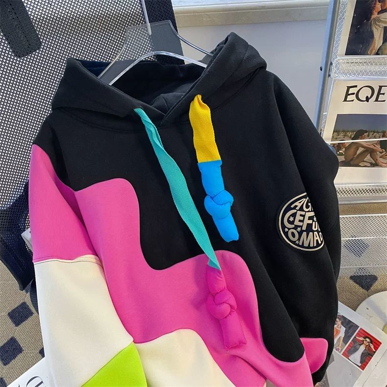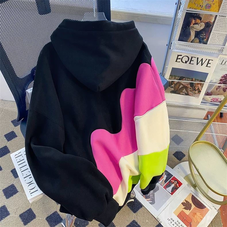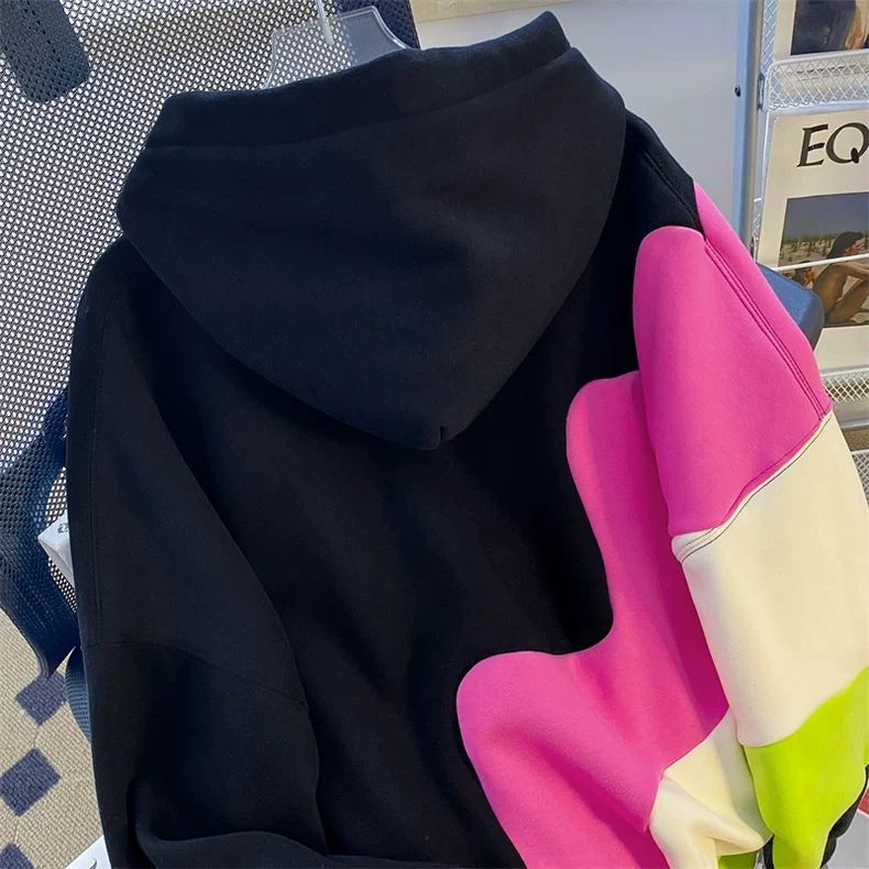 ins撞色加绒连帽卫衣秋冬款慵懒风情侣oversize大码300斤胖mm外套