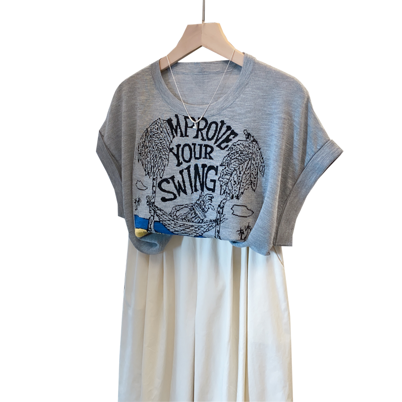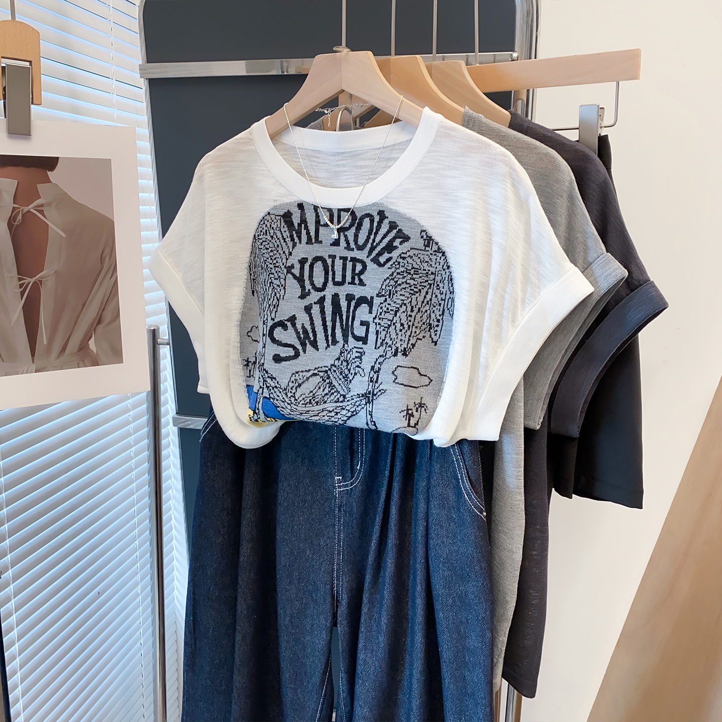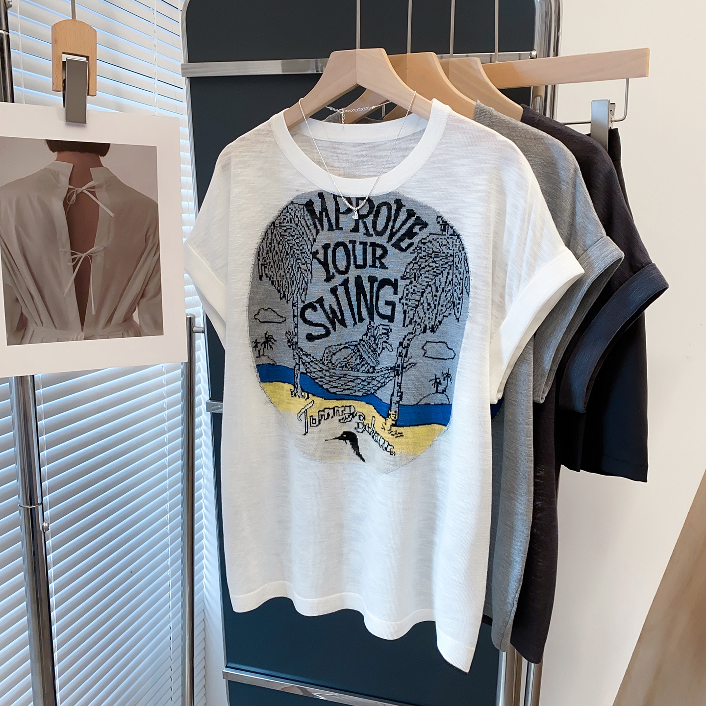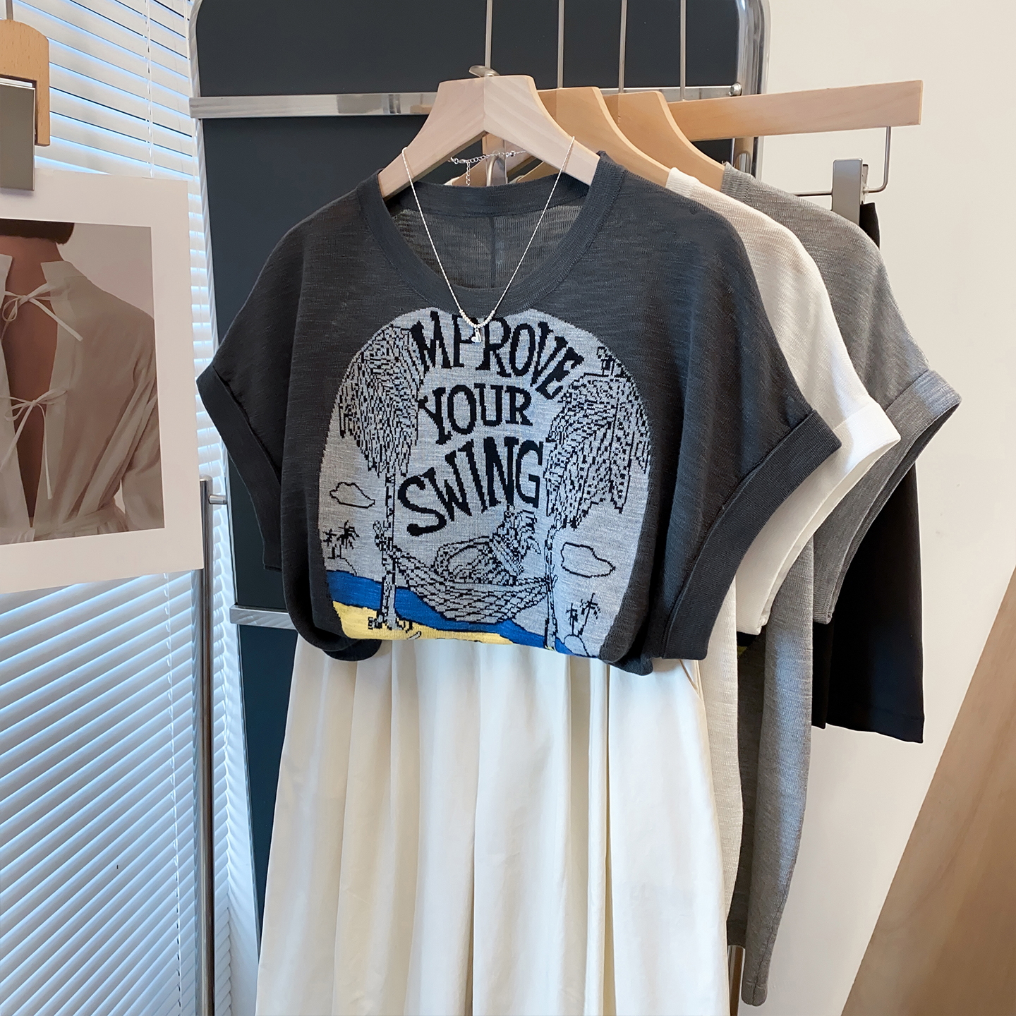圆领提花针织衫女2025夏装新款宽松慵懒风落肩上衣薄短袖t恤衫潮