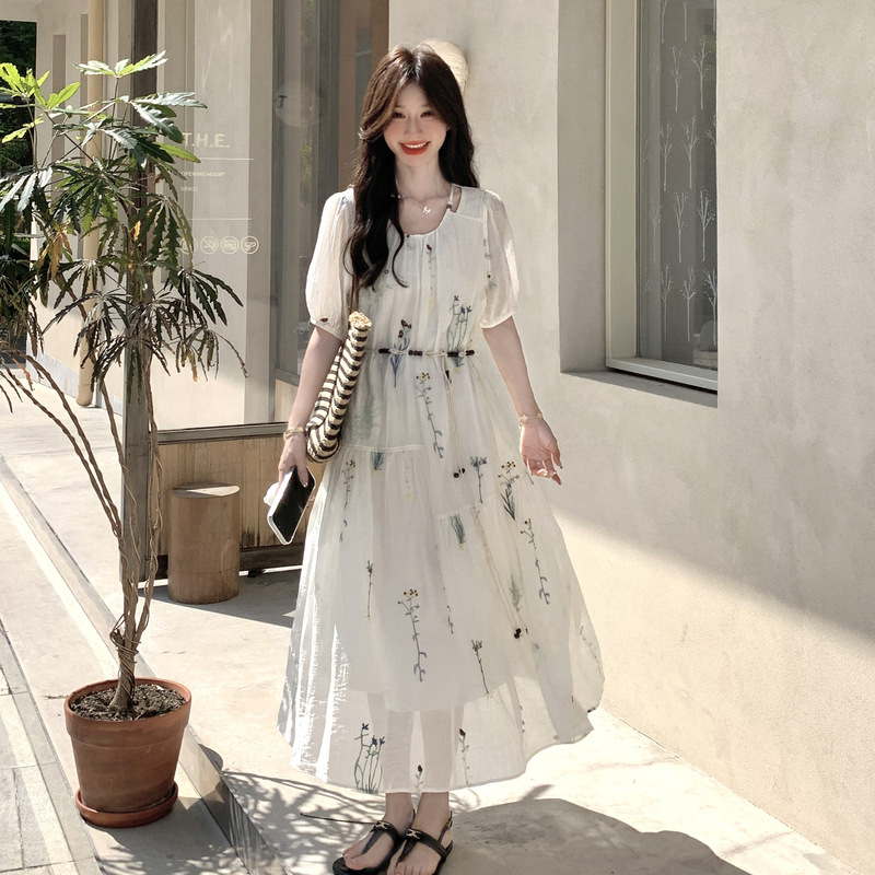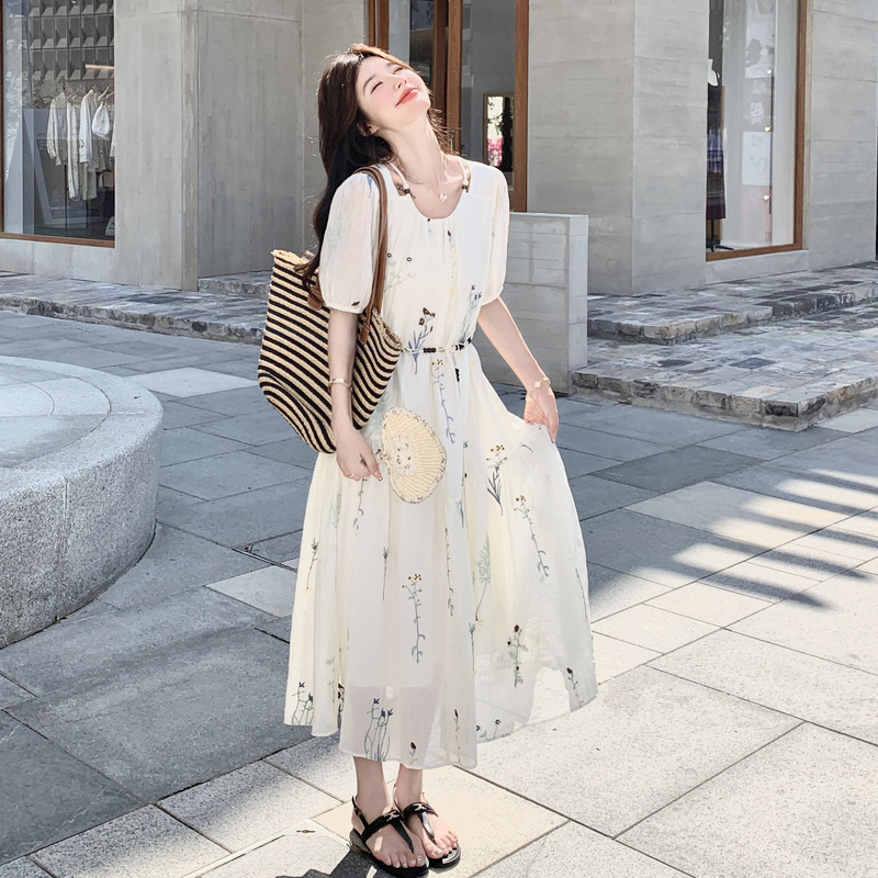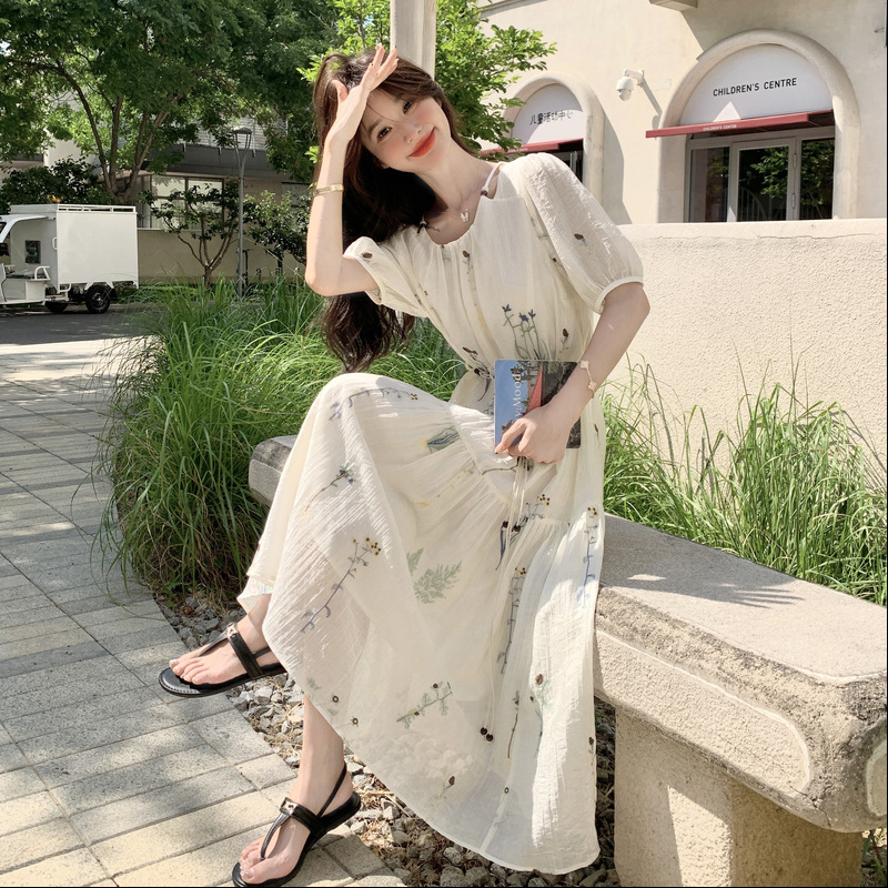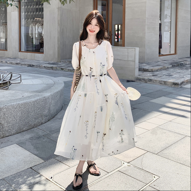 官网女装夏易菲白色法式花朵刺绣天丝连衣裙女夏2025新款气质度假