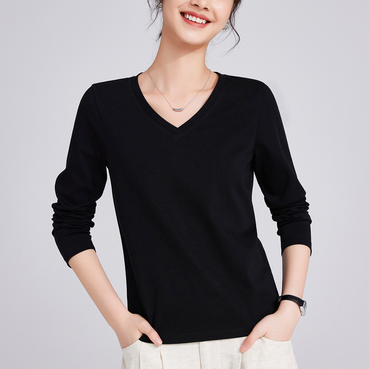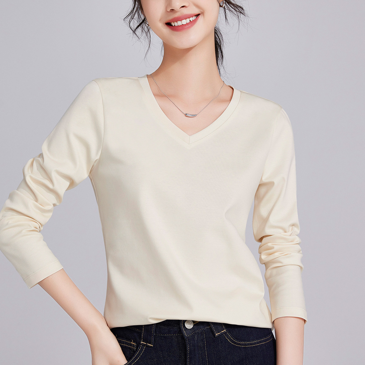 新款2025春秋基础款V领长袖白色T恤女百搭长绒棉宽松丝光棉打底衫
