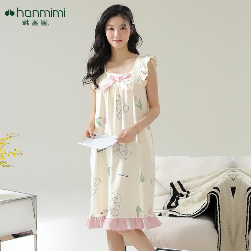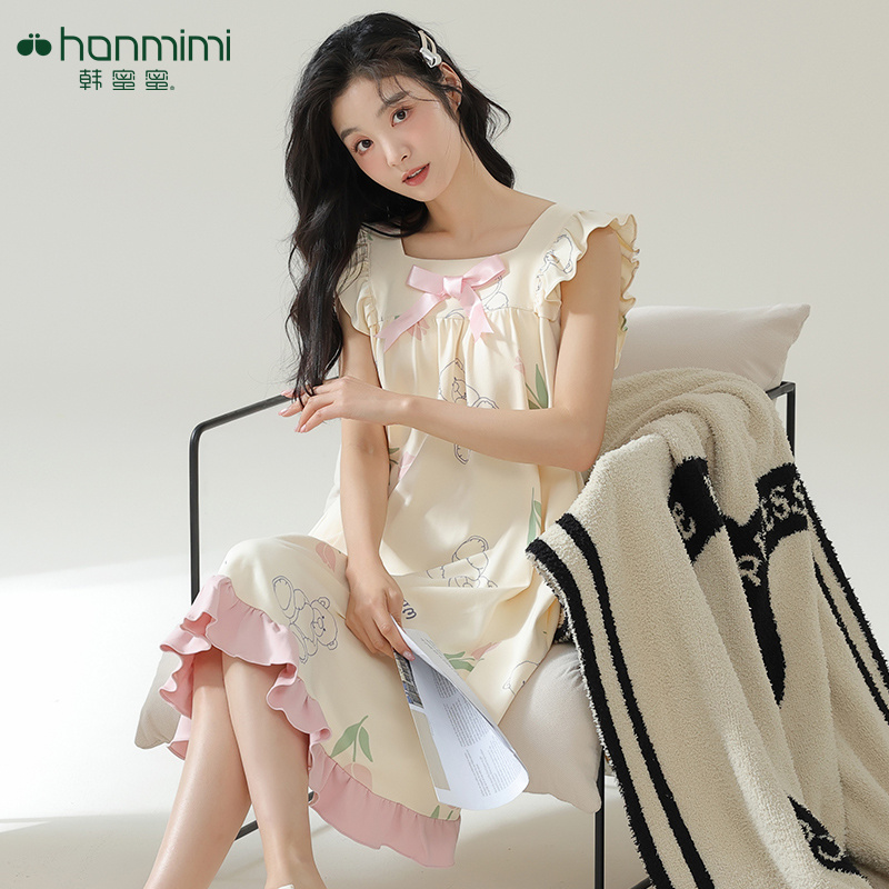 韩蜜蜜韩蜜蜜睡衣女夏季纯棉短袖睡裙中休闲薄款带胸垫甜美家居服