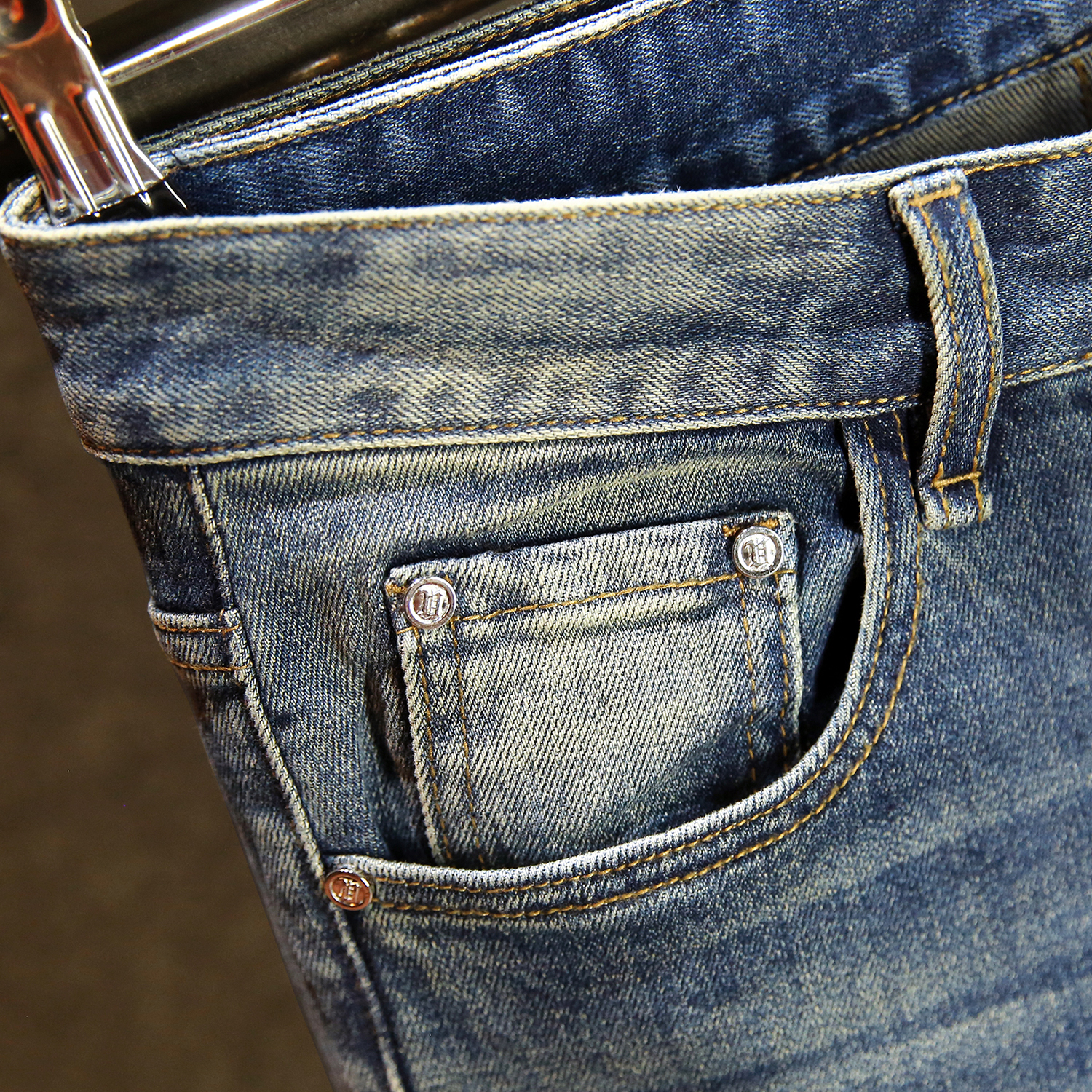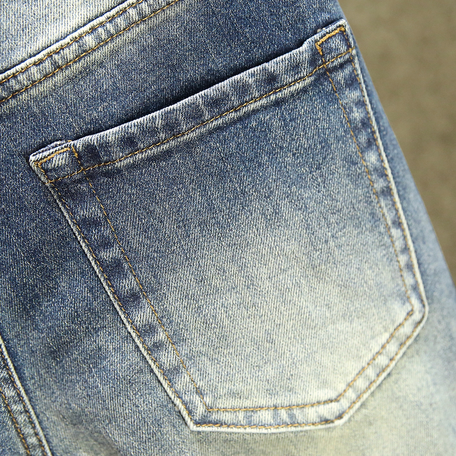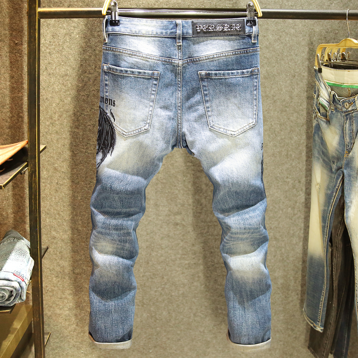 水洗猫须英文印花烫钻牛仔裤男款