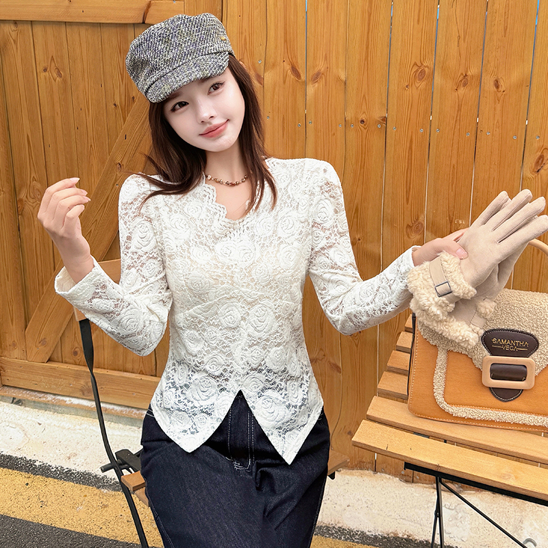 蕾丝打底衫女V领长袖衬衫秋冬新款洋气质内搭镂空设计感开叉衬衣