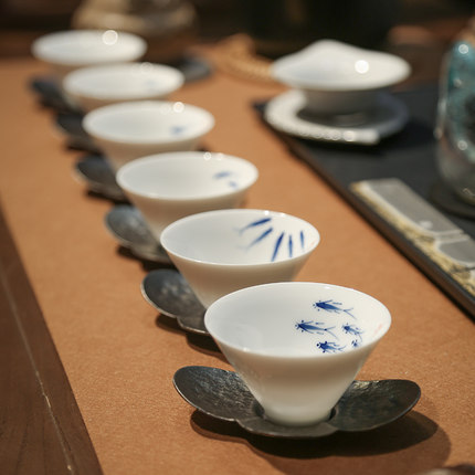 鱼戏6入 景德镇手绘青花鲤鱼杯 螺纹斗笠杯 陶瓷功夫茶具茶杯小号