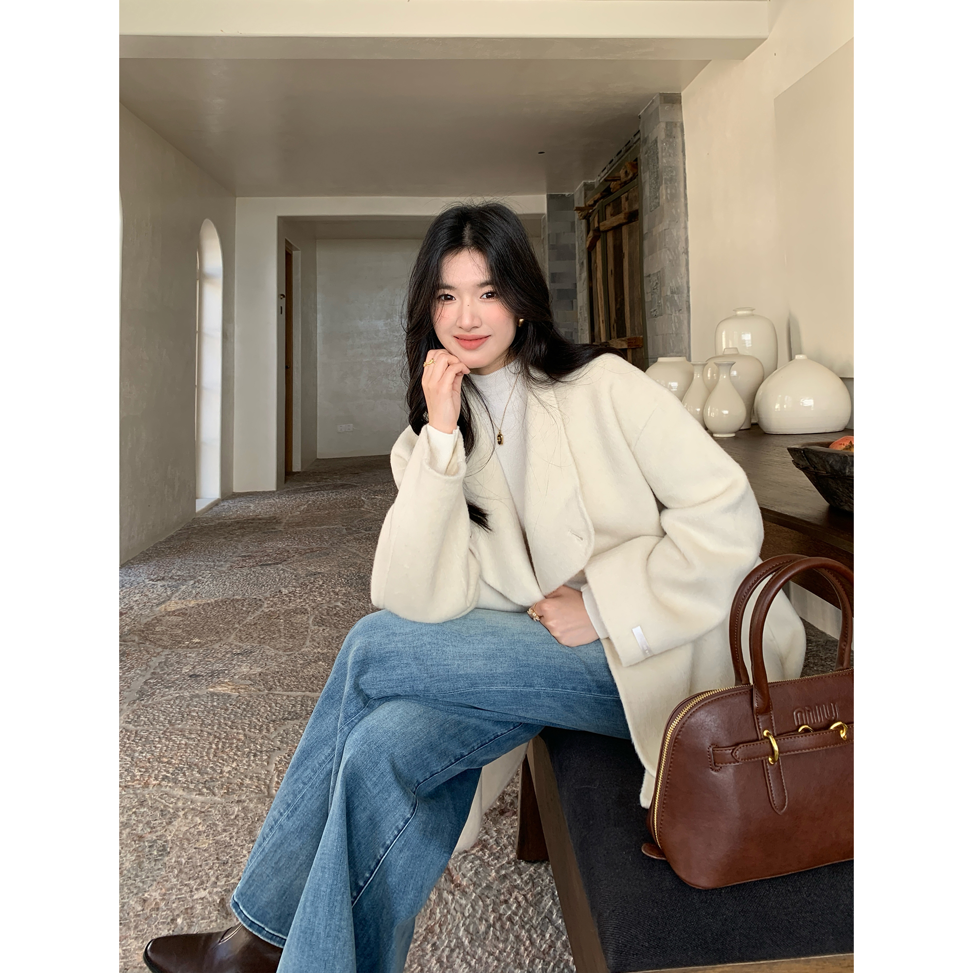 立领双面呢尼子大衣中长款