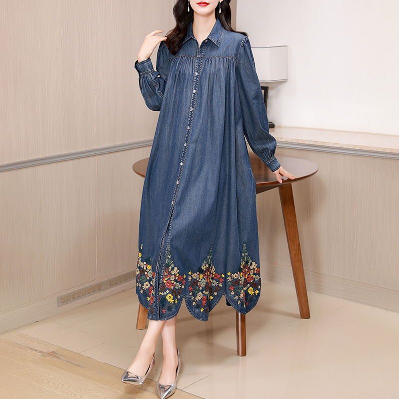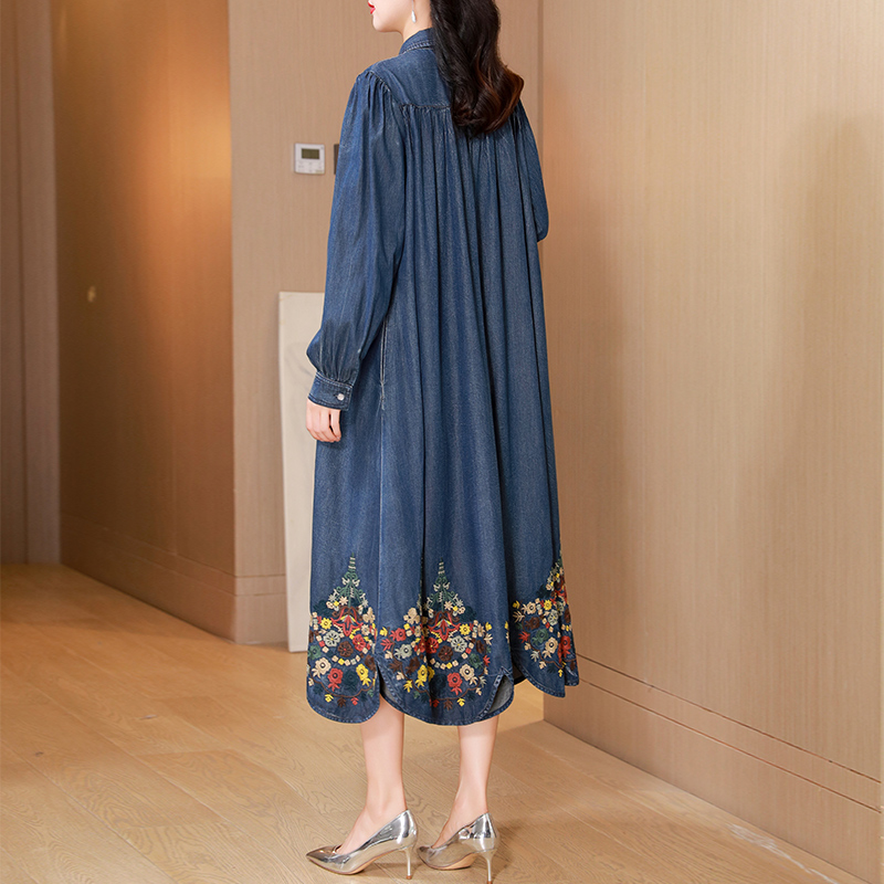 2025春季新款复古刺绣牛仔连衣裙女POLO领宽松显瘦气质妈妈长裙子