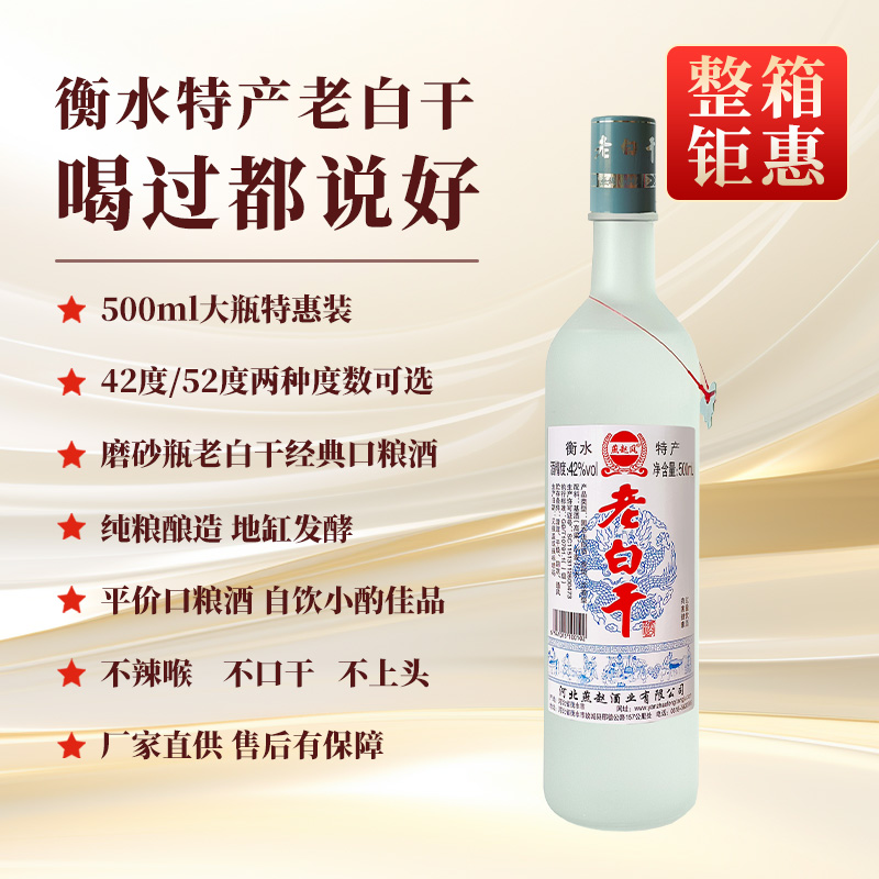 衡水特产酒老白干42/52度白酒整箱磨砂瓶装纯粮食浓香型特价酒水