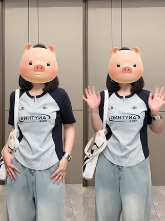 大码胖mm美式复古插肩短袖印花t恤女夏撞色休闲oversize上衣ins潮