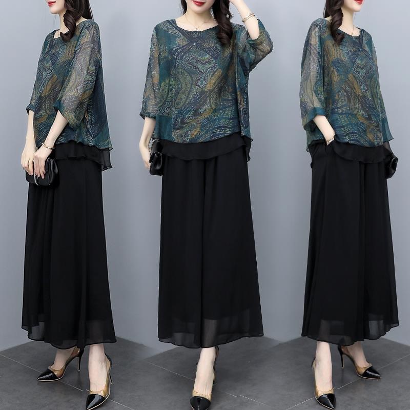 2024新款夏装雪纺衫上衣裤两件套阔腿裤大码休闲时尚装套装女洋