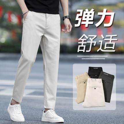 男生休闲裤锥形九分裤修身直筒米白色裤子男 9分时尚男裤夏季薄款