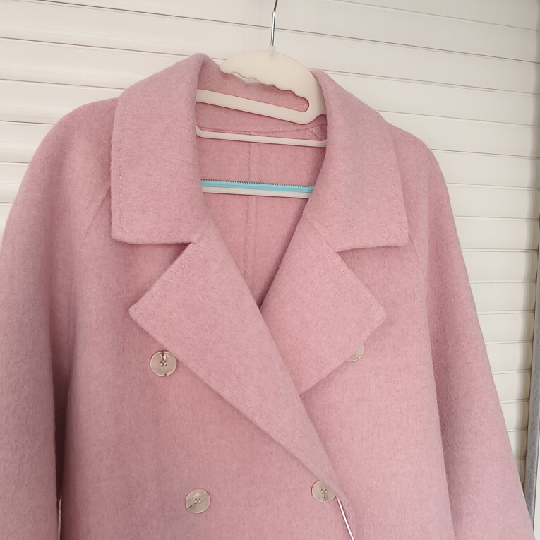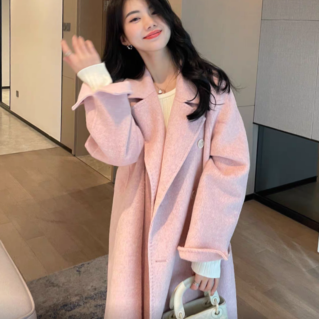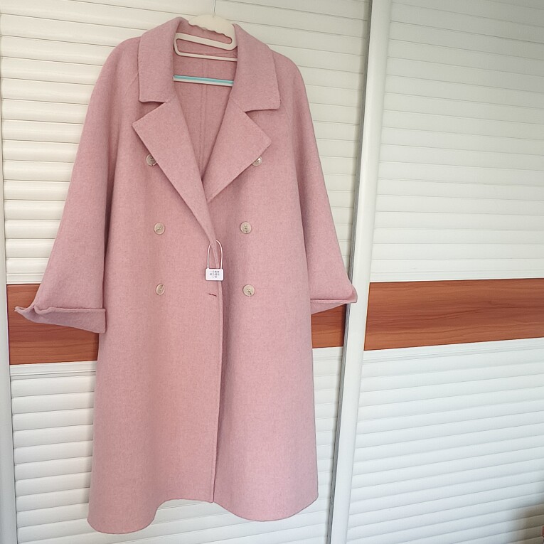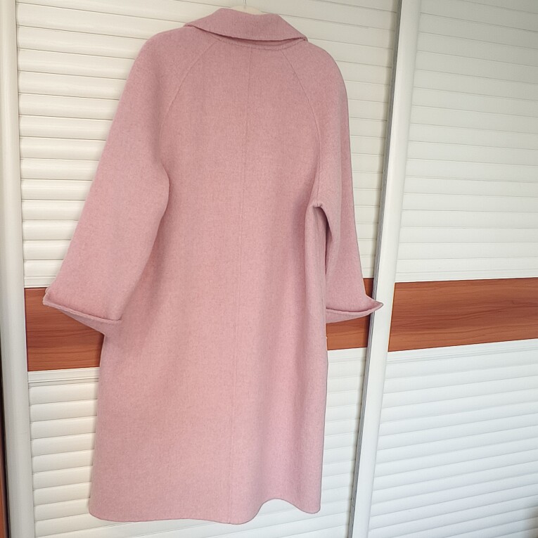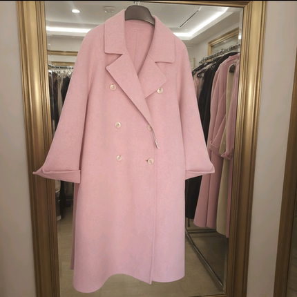 90%羊毛拱针喜庆三文鱼长款赫本风双面羊毛呢大衣外套,清仓