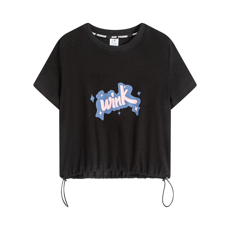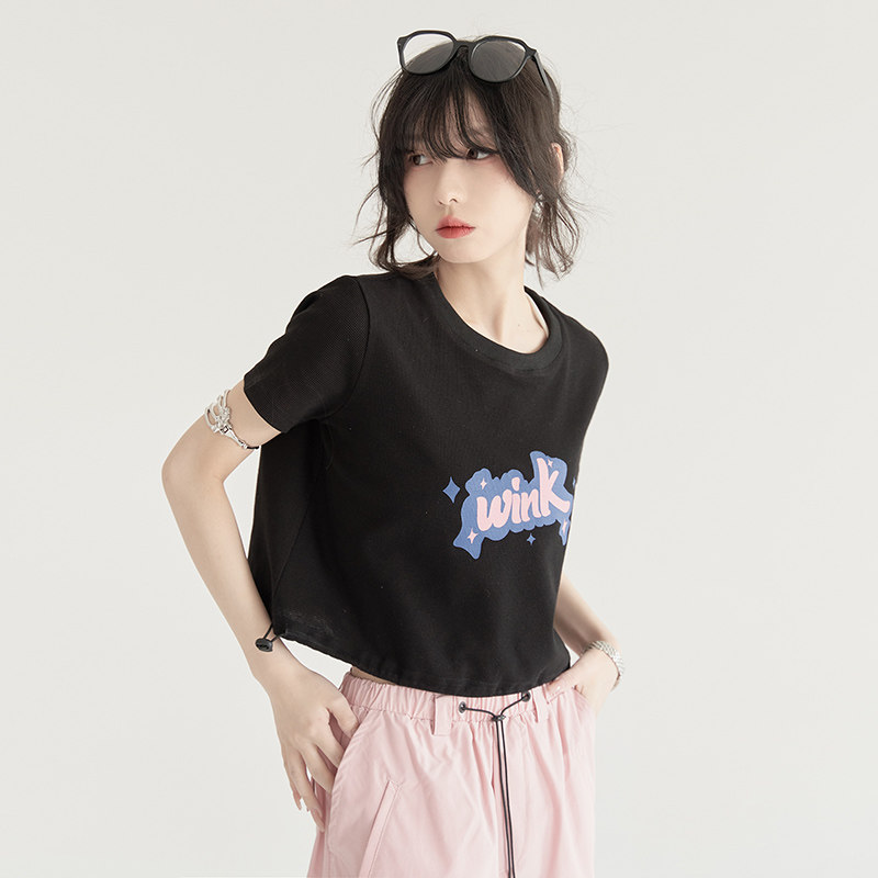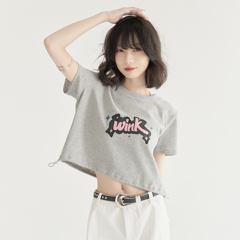 万有引力博物馆 印花短款短袖T恤女夏季2025新款宽松抽绳露腰上衣