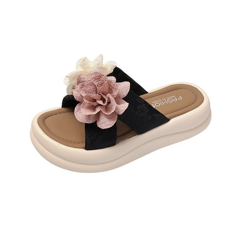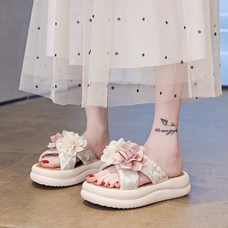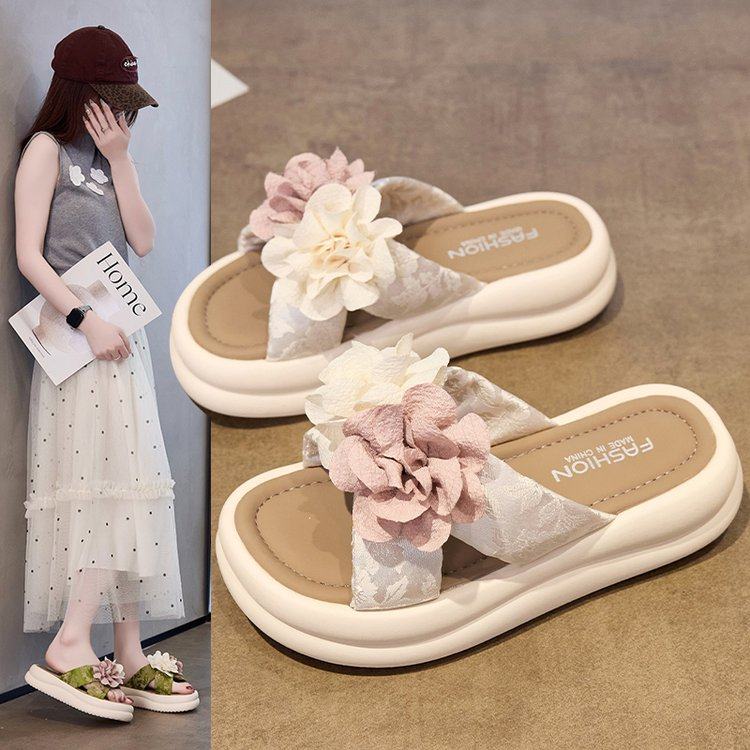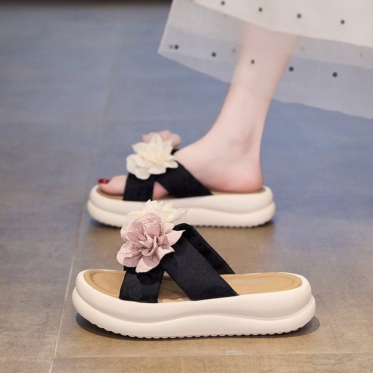 韩版甜美花朵一字拖女夏季轻便舒适外穿小花凉拖鞋踩屎感厚底拖鞋