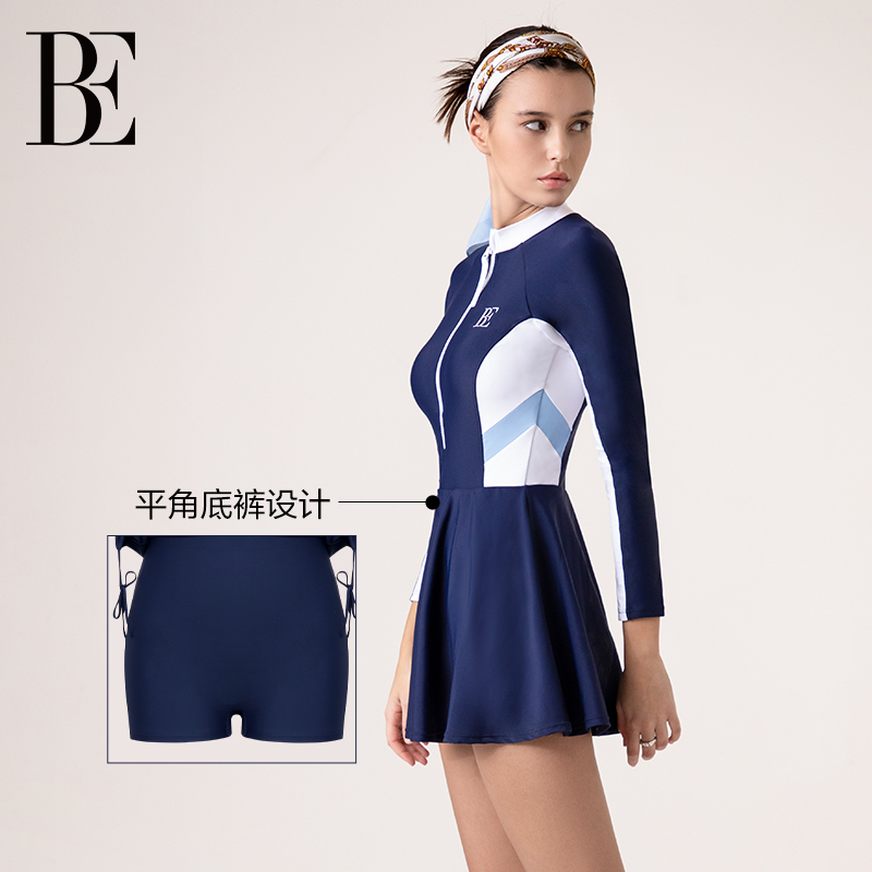 BE范德安连体裙式女长袖时尚大码保守显瘦拼接设计游泳泡温泉泳衣