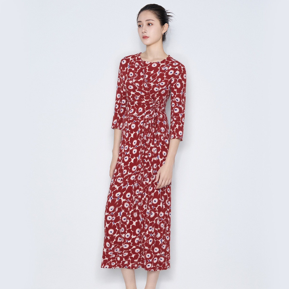 马天奴2025春夏新款红色印花连衣裙子圆领捏褶收腰时尚气质法式女