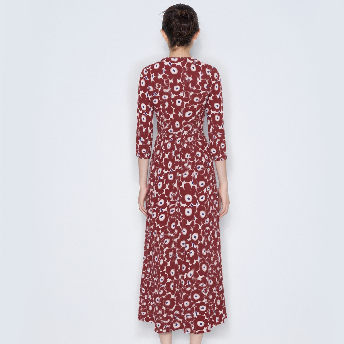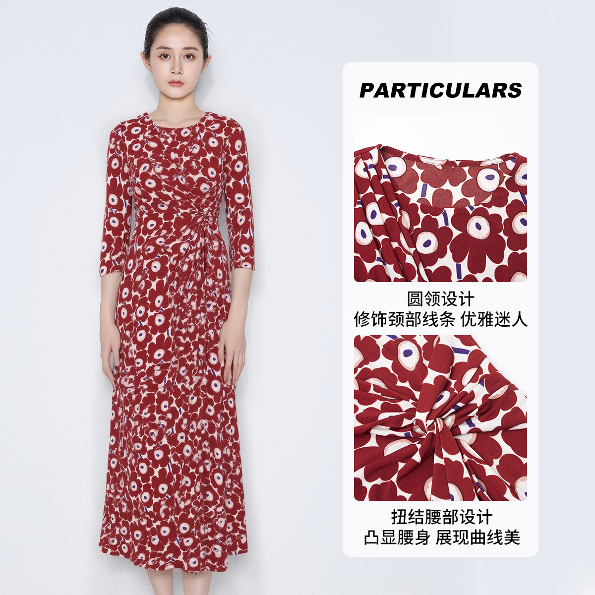 马天奴红色印花圆领收腰连衣裙
