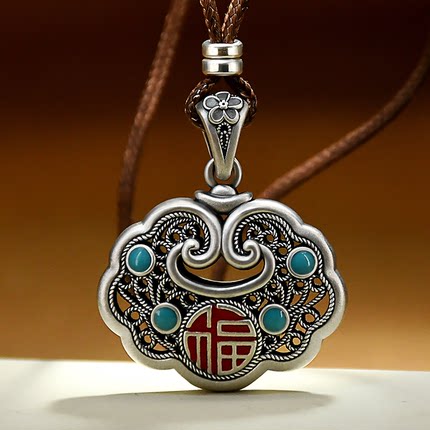 9999纯银如意福长命锁吊坠国风珐琅古法女吊坠足银宝宝平安锁项链