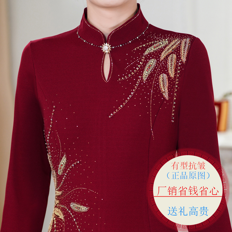 高贵妈妈婚礼手工钉珠高端旗袍连衣裙喜婆婆丈母娘结婚宴喜庆礼服