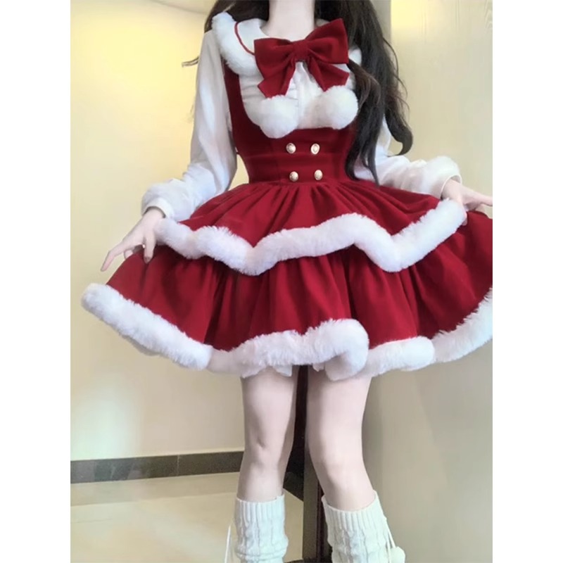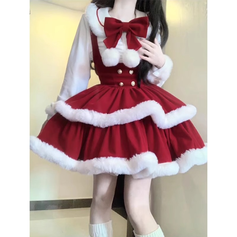 洛丽塔圣诞新年战袍甜美内搭上衣红色丝绒背带连衣裙两件套装女冬