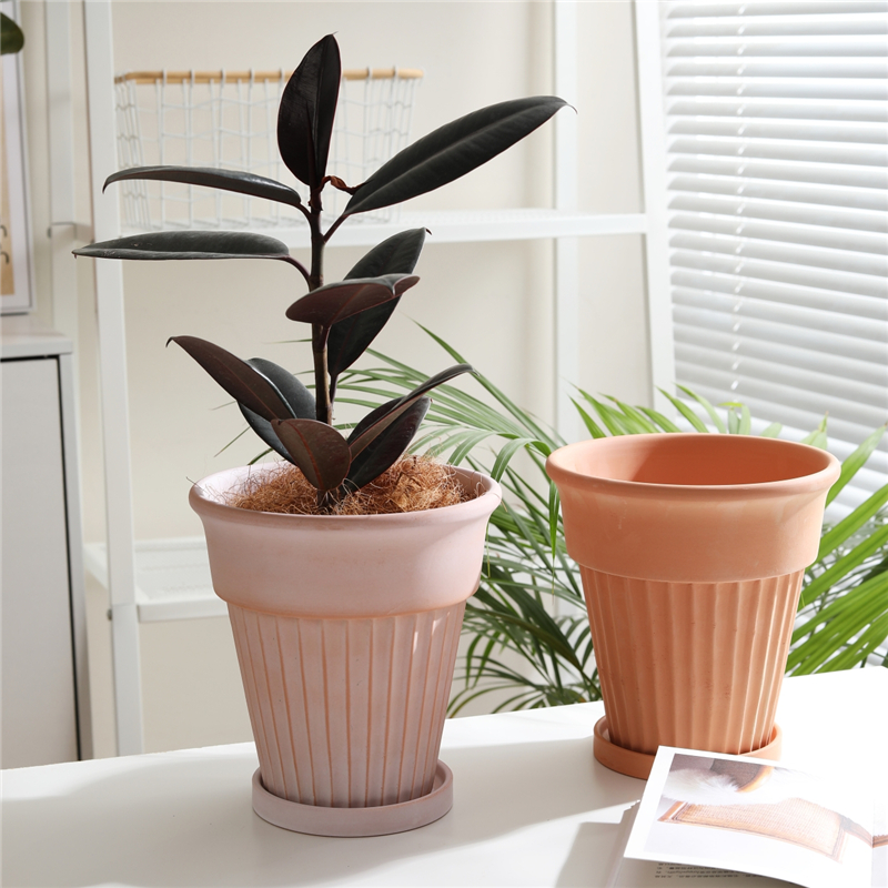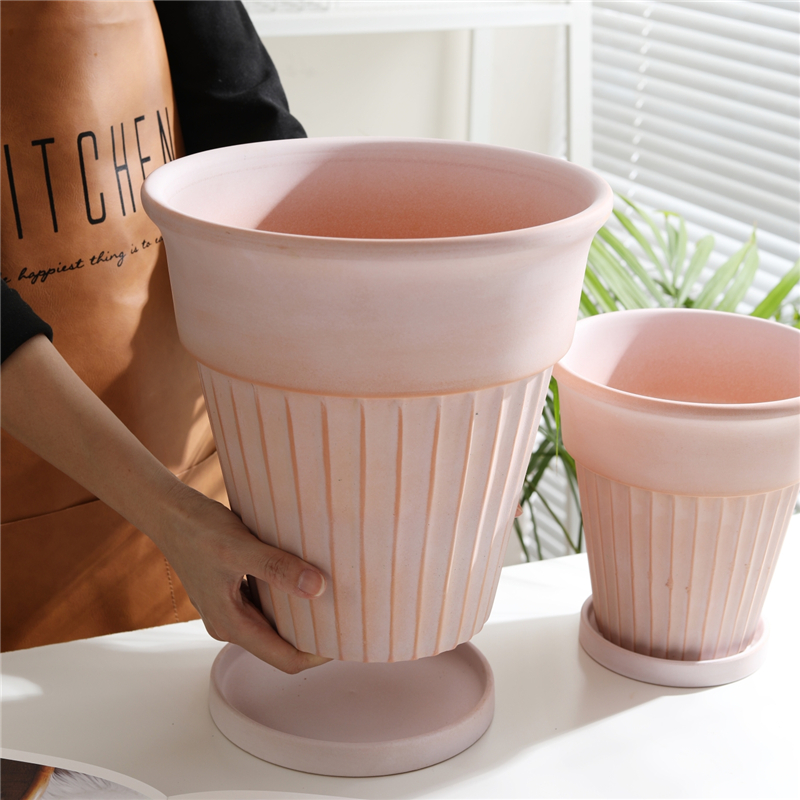 雾化白翻沿条纹红陶花盆植物透气陶瓷陶土盆大口径客厅花园落地盆