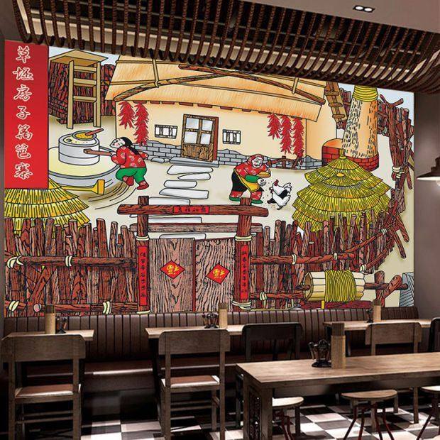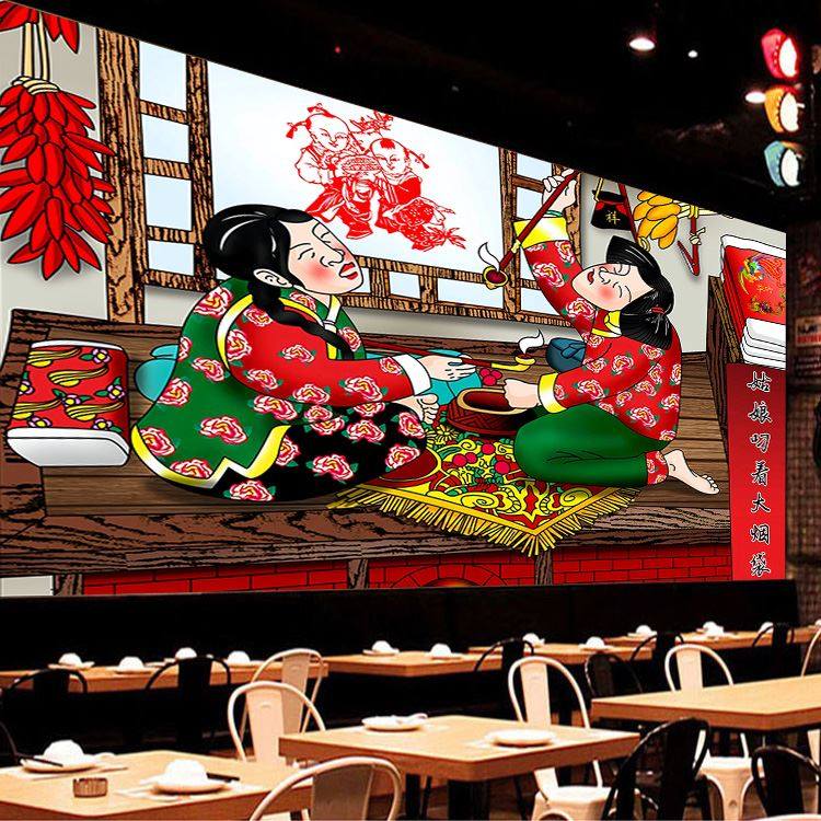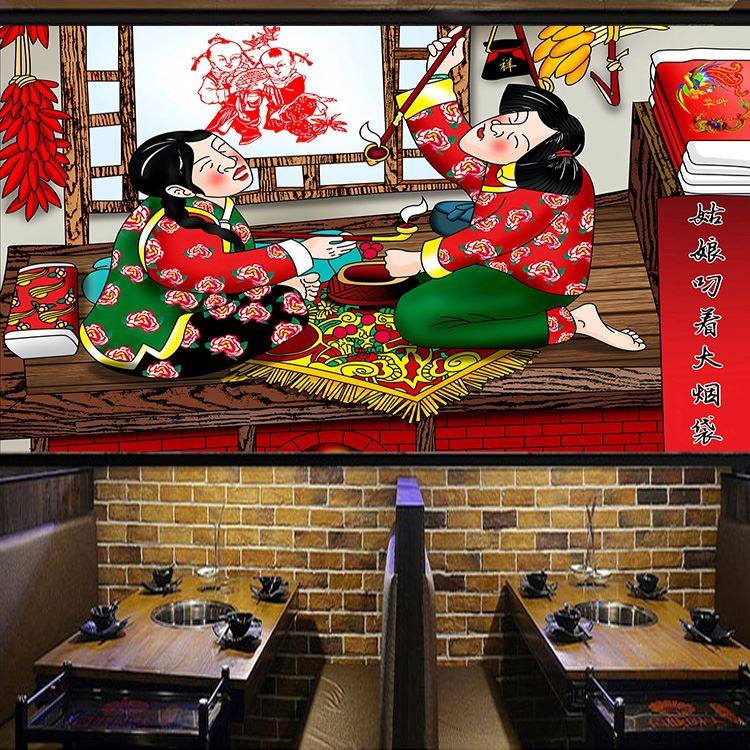 复古东北八大怪背景墙纸铁锅炖农家乐民俗饭店壁纸地锅柴火鸡壁画