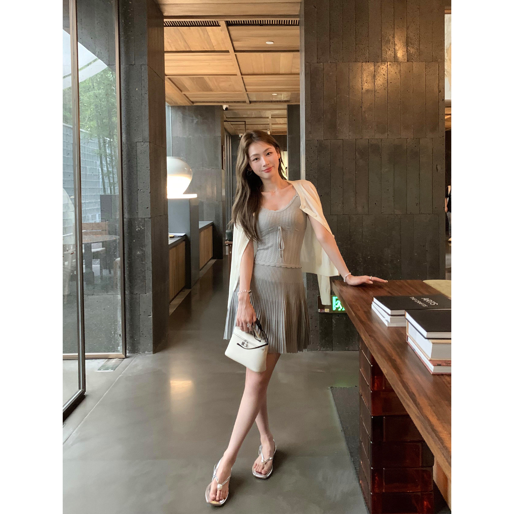 pusumede 【现货7.5折】法式针织吊带连衣裙女百褶裙无袖短裙