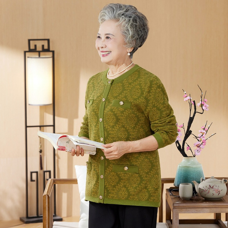 中老年女装秋冬新款针织衫毛衣开衫圆领休闲奶奶宽松口袋扣子外套