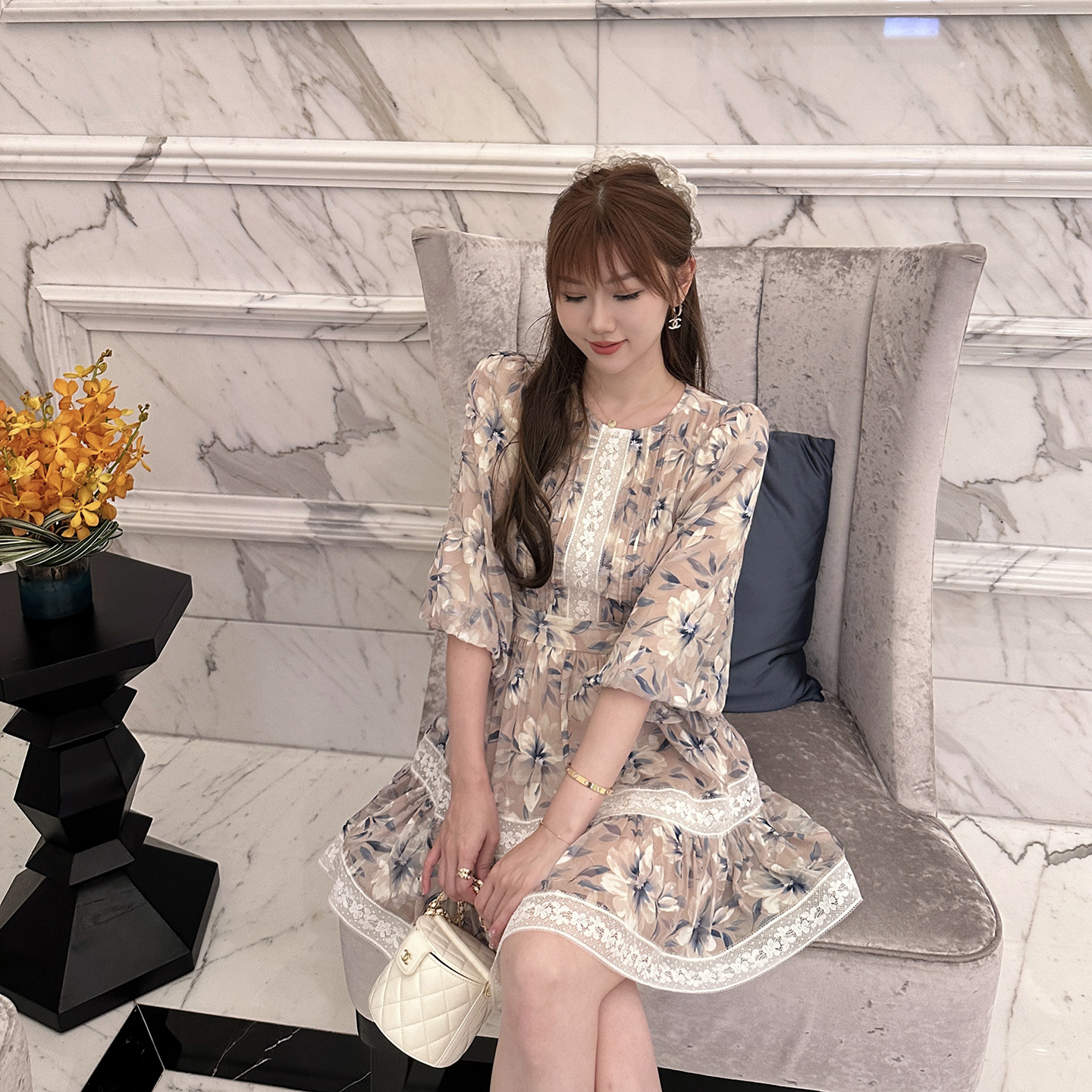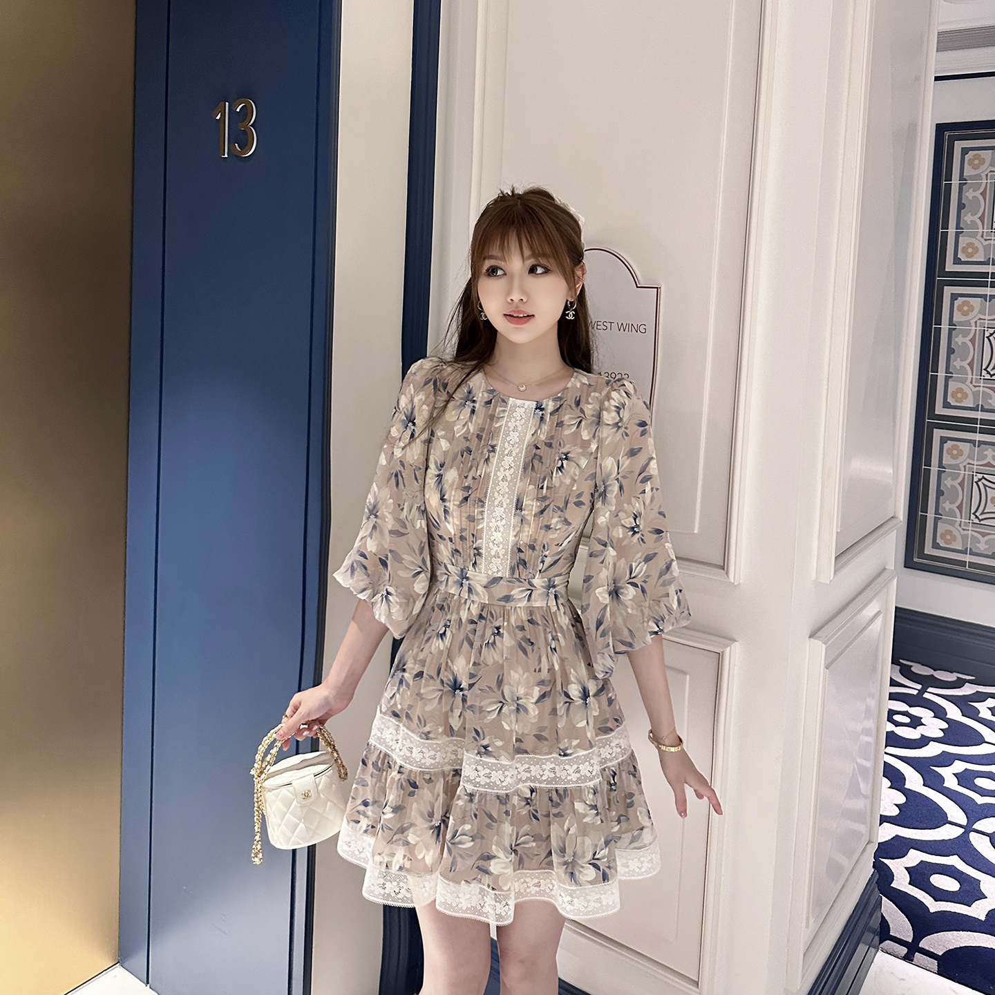 宁芙心心 柔光铃兰 蕾丝花边拼接设计 收腰显瘦雪纺原创连衣裙
