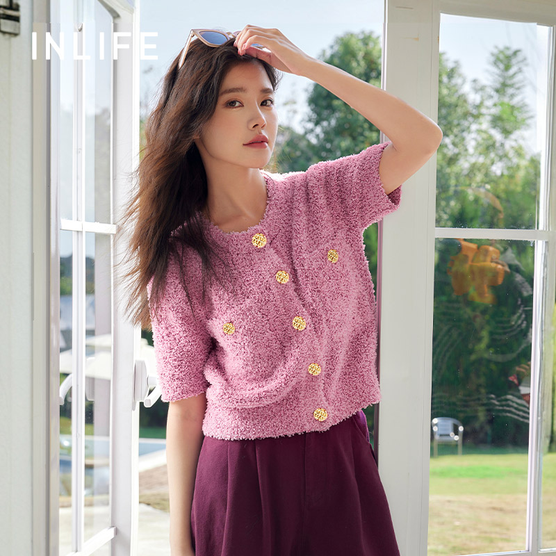 伊纳芙温柔风短款外套圆领针织开衫女2025春新款高级宽松短袖毛衫