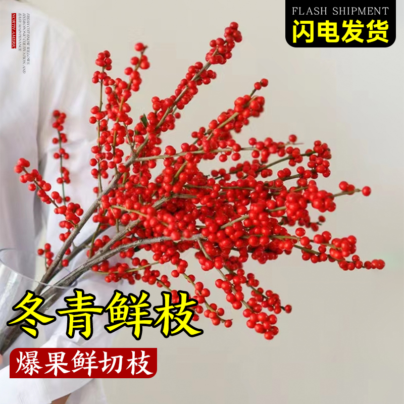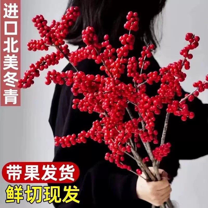 进口北美冬青红果鲜花水培绿植物盆栽年宵鲜切枝真插花卉室内好养